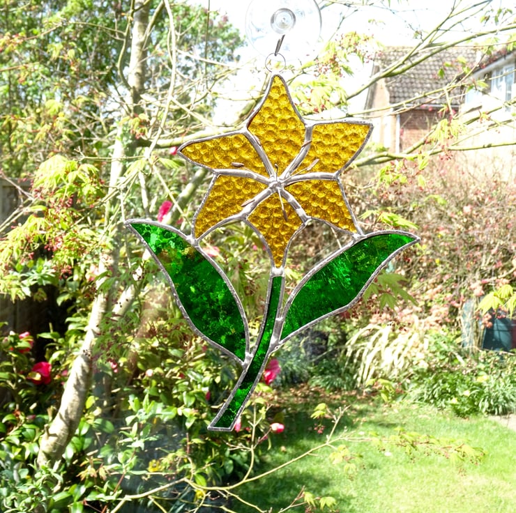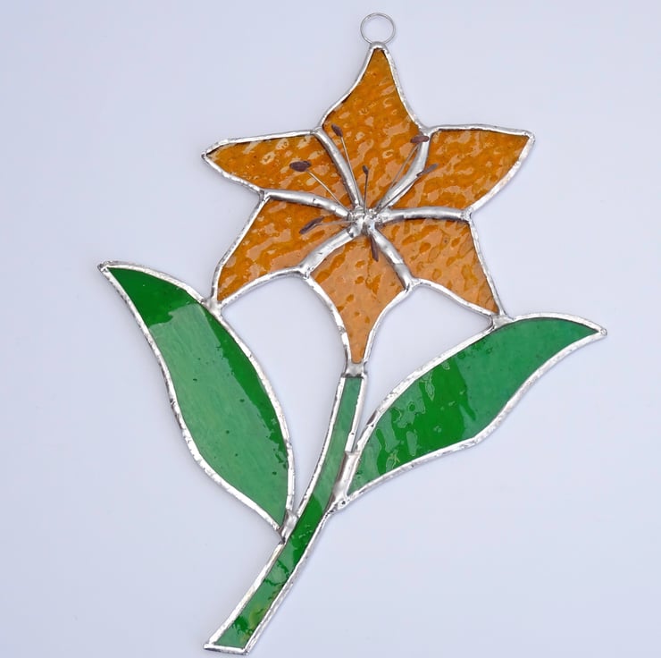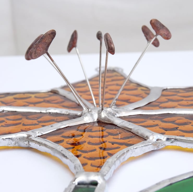Each piece of glass has been copper foiled and soldered together, the stamens have been made from twisted wire, soldered and dipped in patina to give a copper effect. A ring has been attached fro hanging purposes..