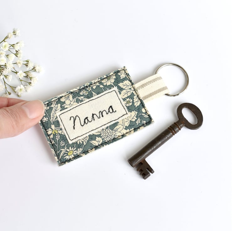 This simple but elegant personalised key ring is embroidered with a name or word of your choice.