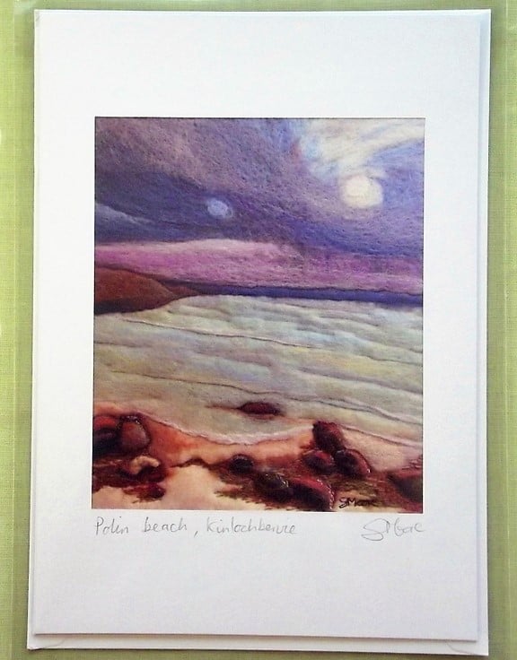 Set of 3 handmade greetings cards using digital prints made from hand felted and embroidered merino wool original artworks by textile artist Sally Moore. The images are of Scourie Bay and Polin beach, Kinlochbervie, and Reedbeds at Ardgay, all in the Scottish Highlands.