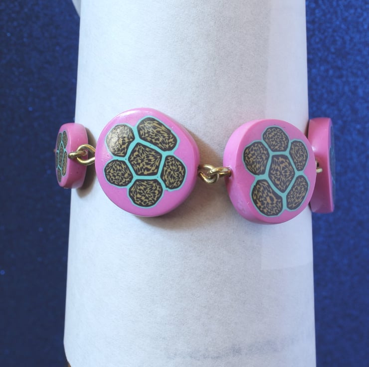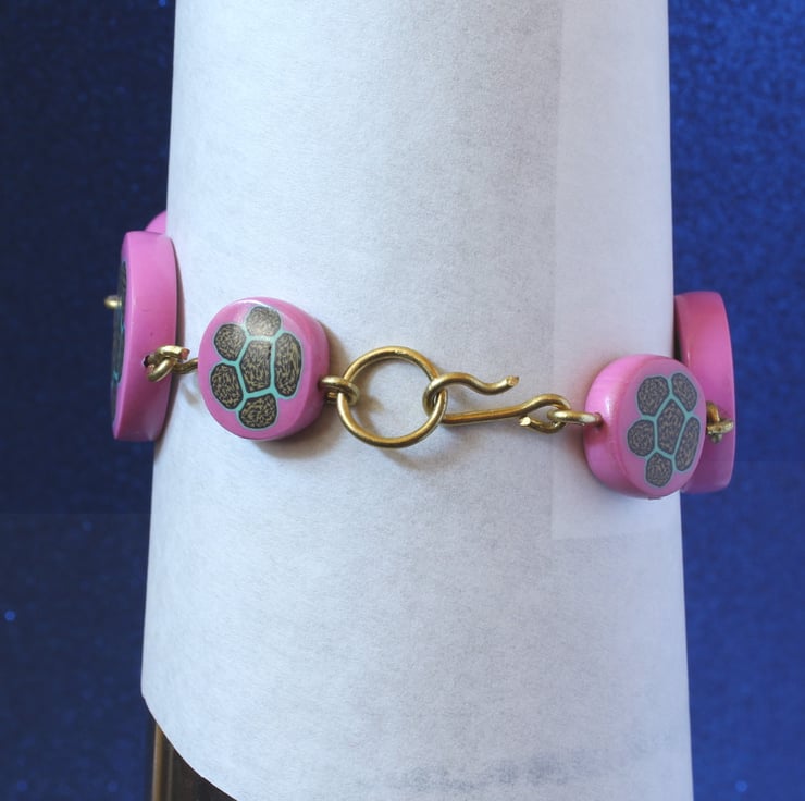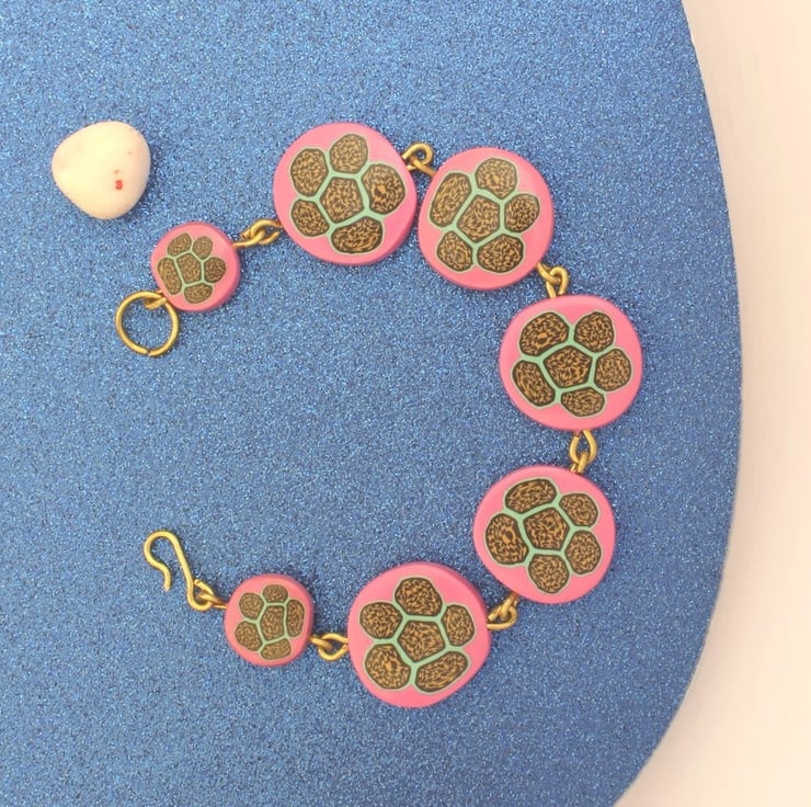 The bracelet is composed of artisan flowery tiles made from polymer clay. This is excellent, lightweight and hard-wearing material that will keep its rich tones for many years. The fairly abstract minimalist flowery design is one of my own. The tiles, 7 in total, are linked together with brass wire links, giving very reliable links and a lovely shiney colour that goes well with the flowers.