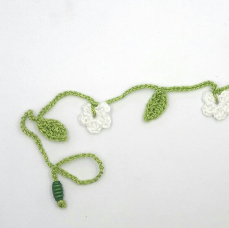 This pretty springtime garland of creamy white blossoms and bright green leaves, is crocheted in cotton and has a wooden bead at each end for easy tying. It measures approximately 170 cm in length and comes wrapped in tissue in a labelled PIP ( Postage in Proportion ) box all ready to be given or posted on as a gift if required.