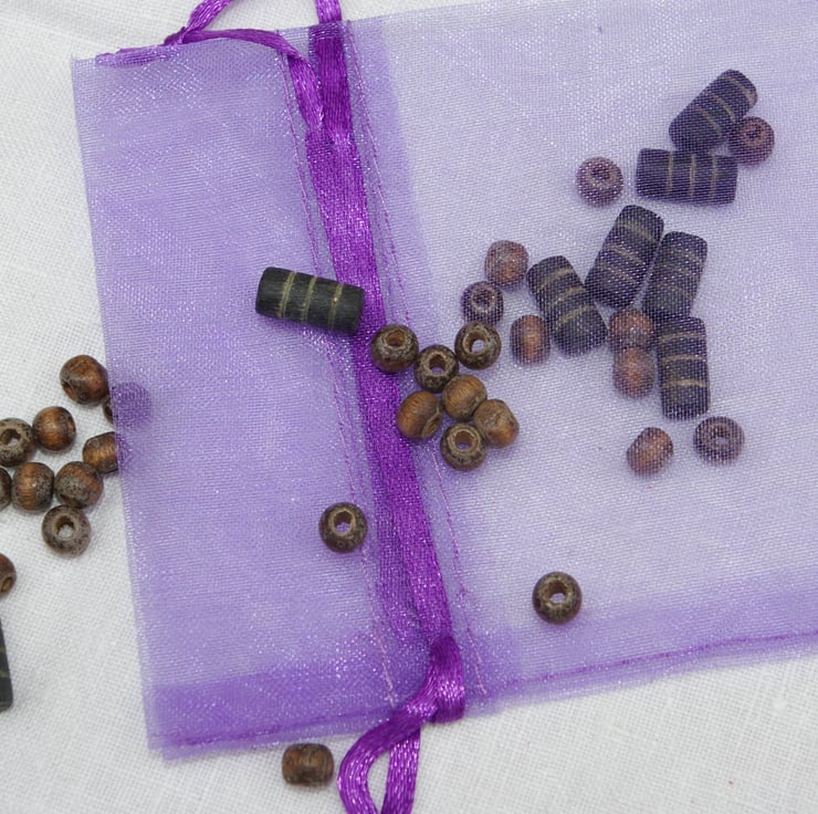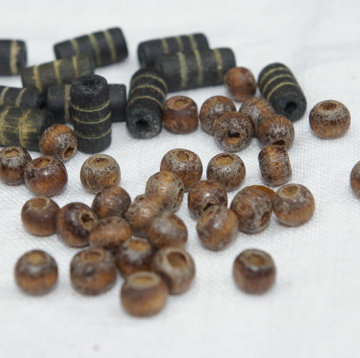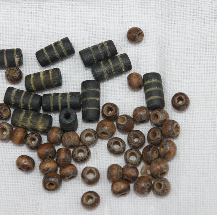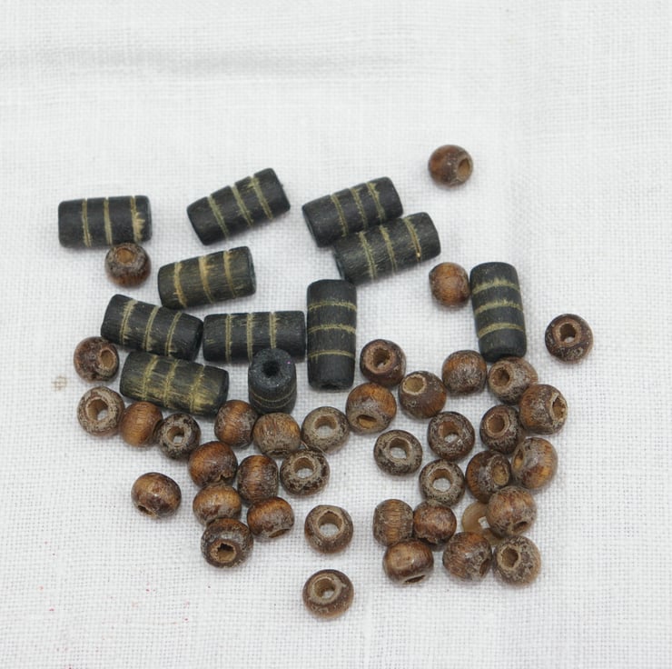 There are Eleven longer black wooden beads with cut lines around them. The bag also contains Thirty-Six smaller round rustic brown wooden beads.