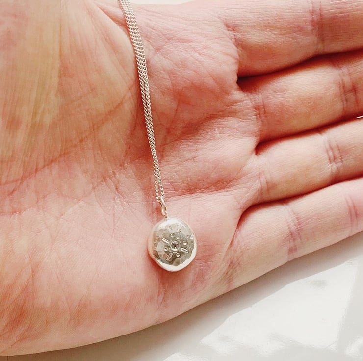 Sun design pendant, melting sterling silver into a nugget hammer to shape and texture and applying the sun design free hand with metal stamps.