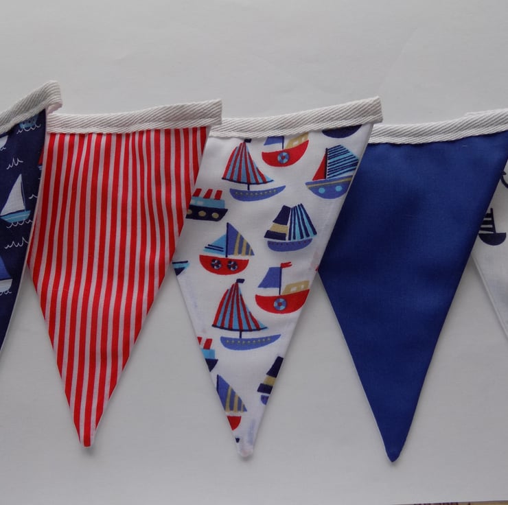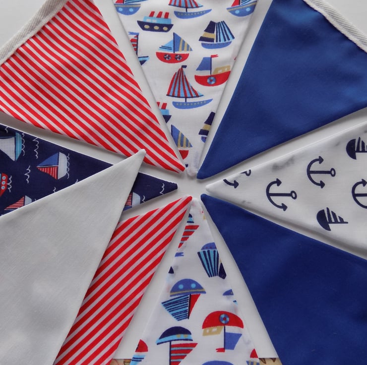 Made from a variety of five different seaside themed fabrics, including sailing boats, anchors and stripes, this brightly coloured red, blue and white bunting will add a fun decoration to any event!