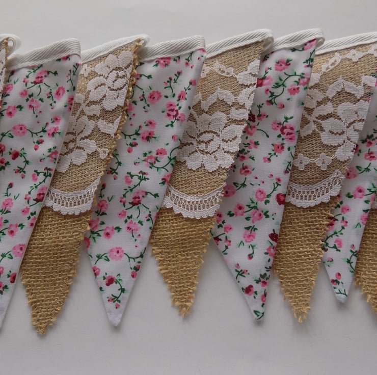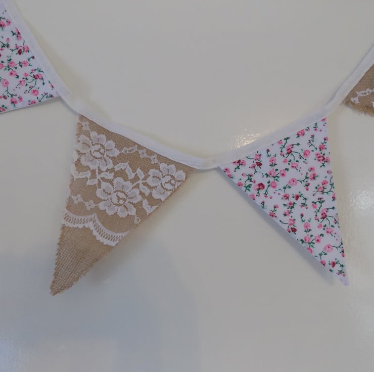 Brighten up any room in your home with this beautiful and very feminine hessian, lace and floral fabric bunting.
