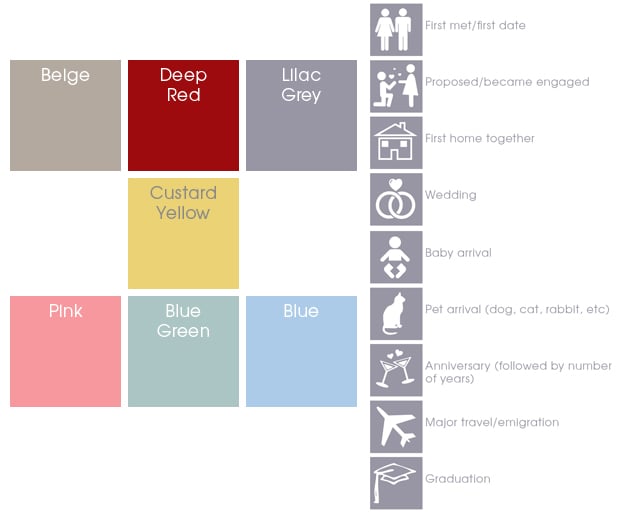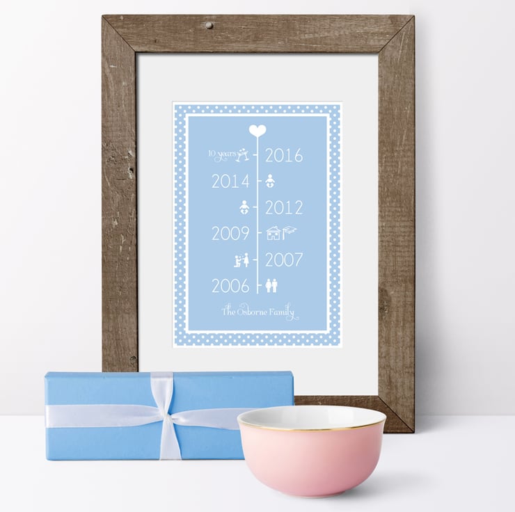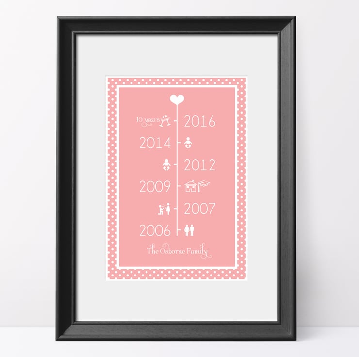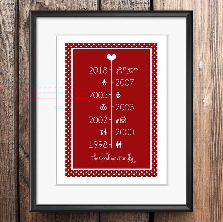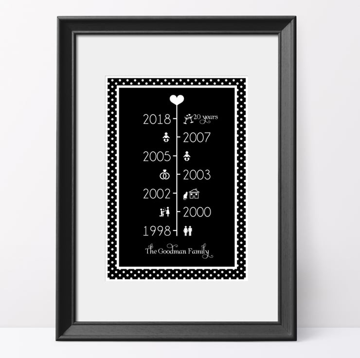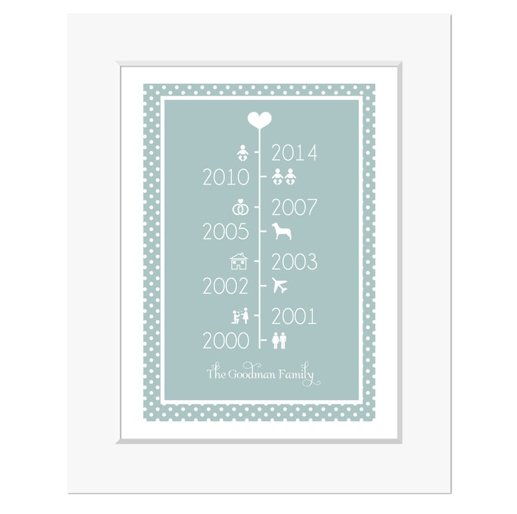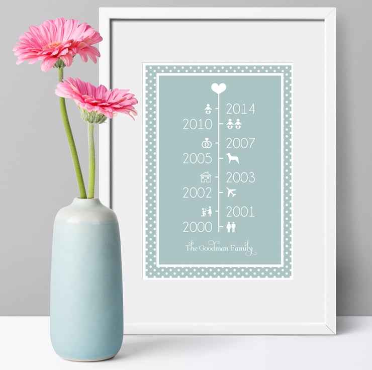 Featuring your family surname, the Timeline print is available in a wide range of colours (see image for colour options) and can feature between 4 and 8 key years, with a maximum of 3 events happening in any one year.