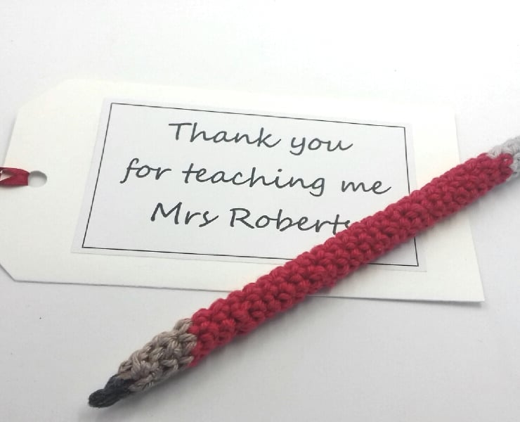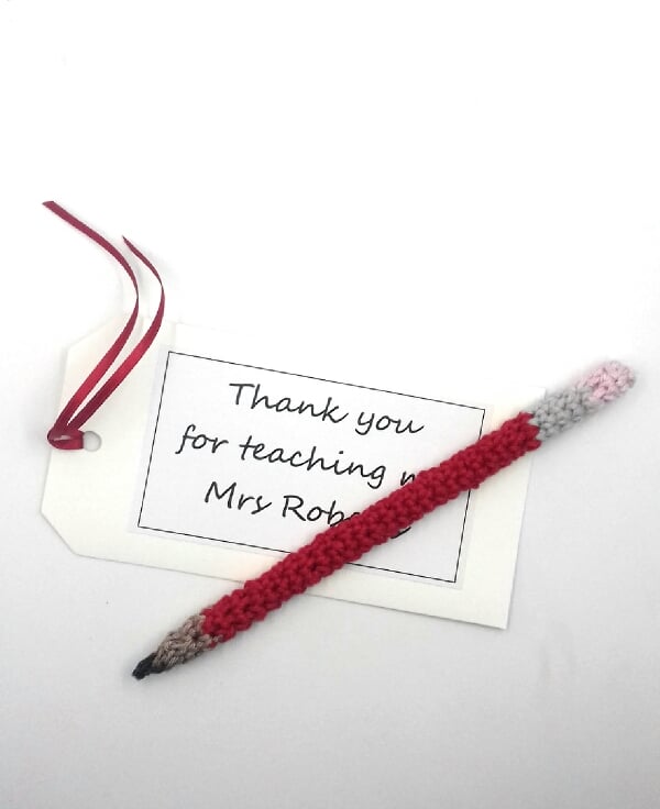 A novelty gift and thank you message in one! This pencil has been crocheted in cotton around a paper lolly stick and the point has been stiffened slightly with PVA. It is teamed with a tag bearing your child's message to their teacher. The pencil measures approximately 17 cm in length and it and the tag come wrapped in tissue in a labelled PIP ( Postage in Proportion ) box all ready to be gifted!