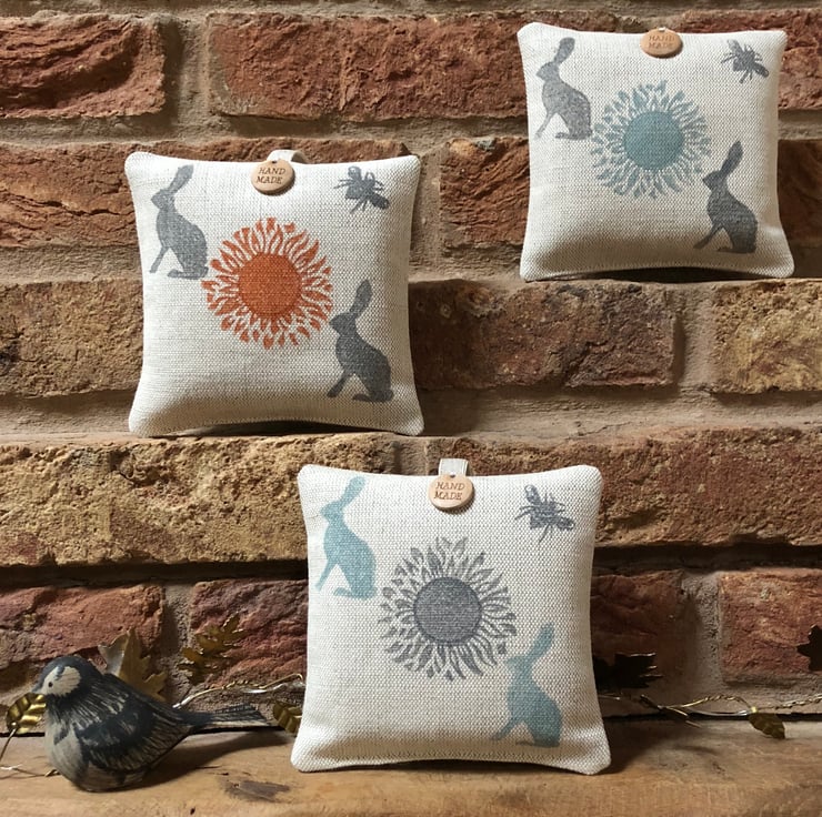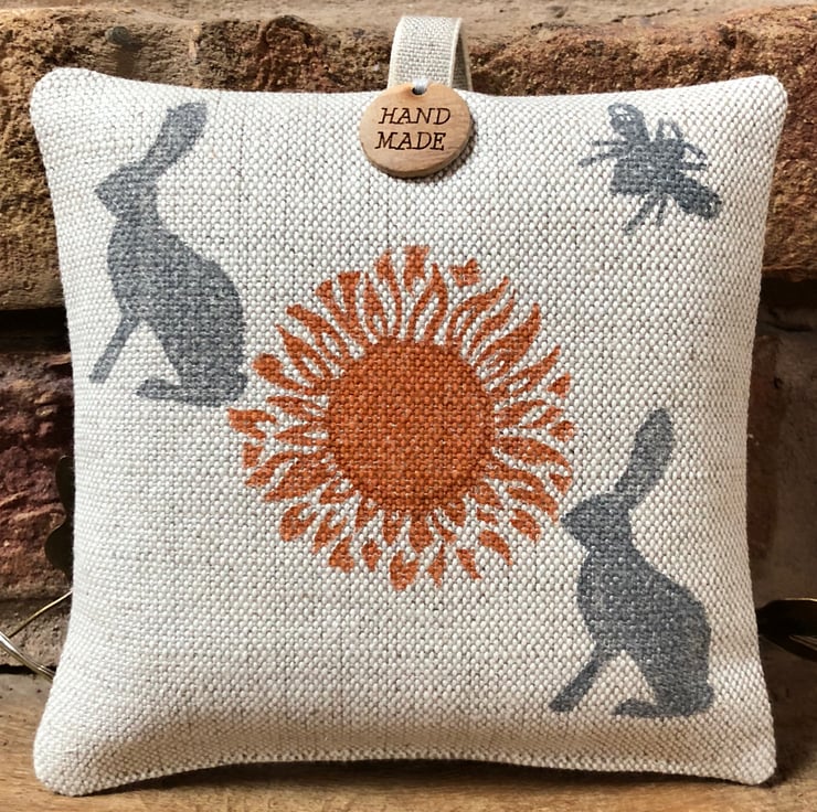 A hanging Lavender sachet constructed from a beautiful linen fabric which I have block stamped with a typical countryside theme.Embellished with a ' Hand Made' wooden tag .Generously filled with fragrant Cotswold lavender .A lovely item perfect to fragrance wardrobes,drawers,boot/utility rooms or alternatively just hang as a decorative item in your home.