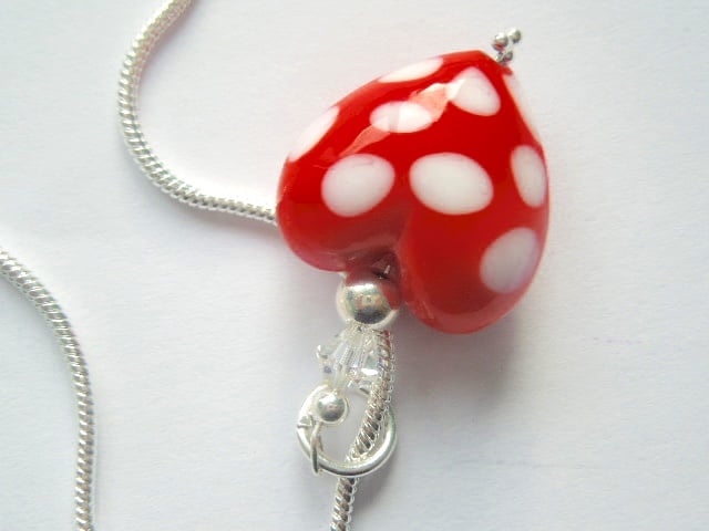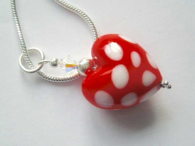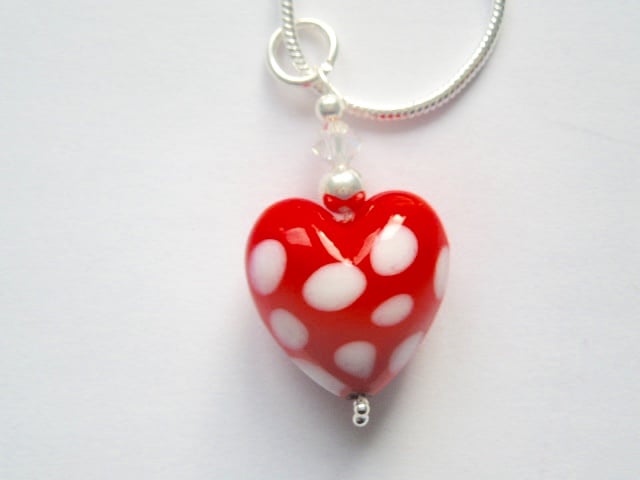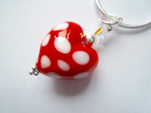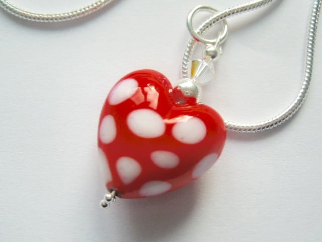 A pretty and unusual Murano glass pendant with a red and white polka dot Murano glass heart (20mm) with a glittering Swarovski crystal bead and a sterling silver round bead on a sterling silver snake chain (18ins). The pendant measures 30mm in length and is presented in a pretty organza gift bag all ready for giving. All Murano glass used is genuine and sourced on the island of Murano, Venice.