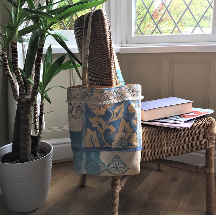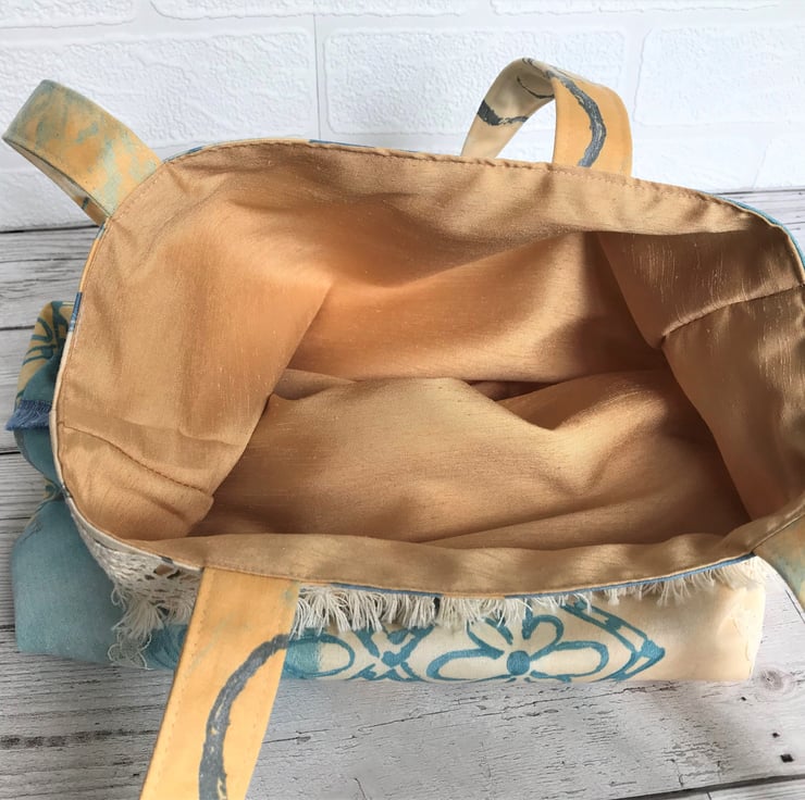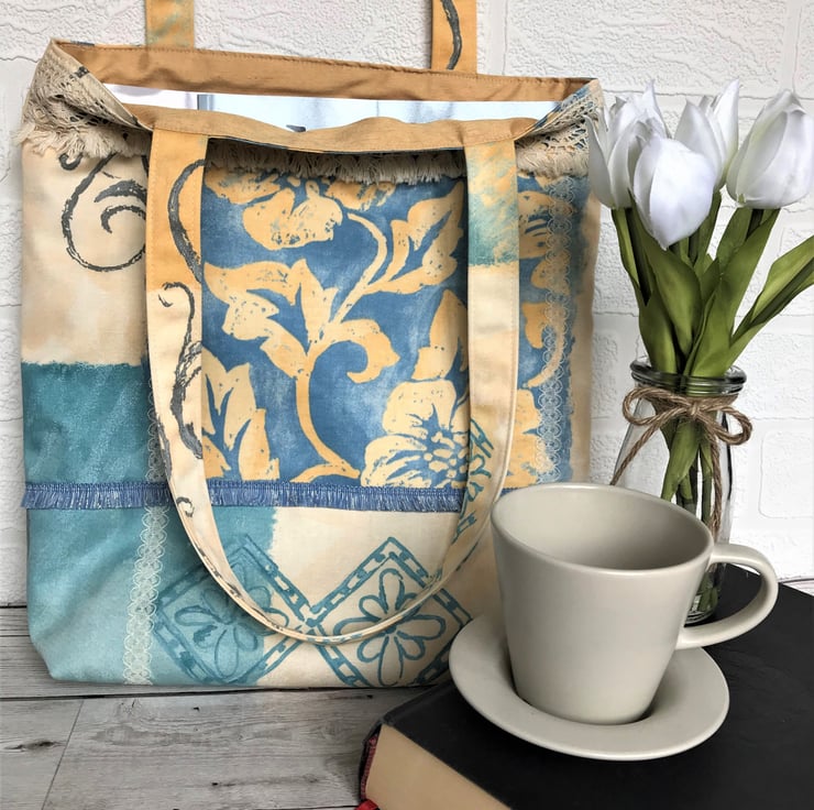 A pretty boho-style tote bag in a striking print fabric trimmed with lace and tasselled ribbon. The fabric print features blocks of colour in pale yellow, blue, turquoise and golden yellow along with floral and abstract patterns in golden yellow, turquoise and grey. The pattern on the front of the bag is enhanced with two vertical stripes of cream lace. A wide cream lacy trim with a tasselled lower edge runs along the front top edge of the bag and there is a blue tasselled trim lower down. There is a single vertical stripe of cream lace on the back. The bag is fully lined with a lovely golden yellow fabric with a slight sheen.