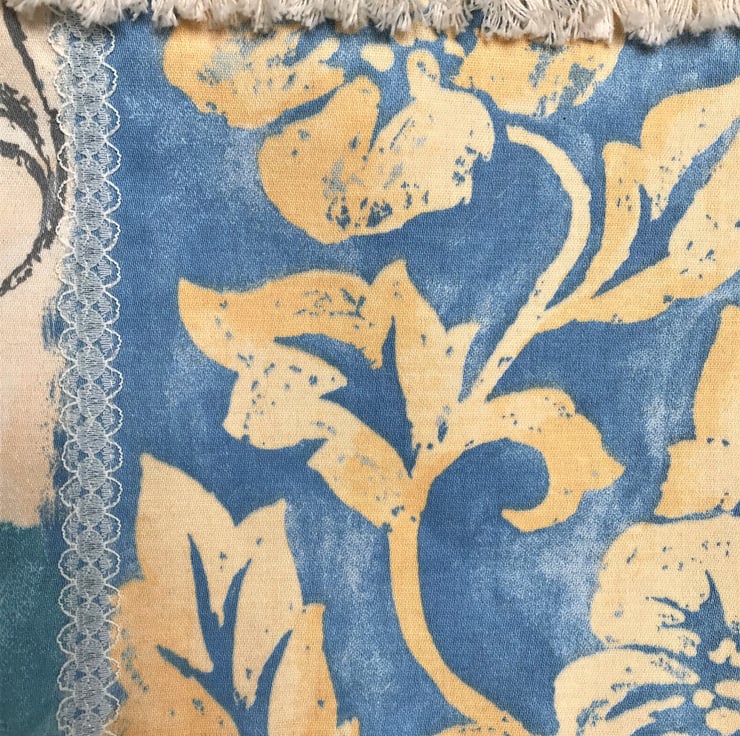 A pretty boho-style tote bag in a striking print fabric trimmed with lace and tasselled ribbon. The fabric print features blocks of colour in pale yellow, blue, turquoise and golden yellow along with floral and abstract patterns in golden yellow, turquoise and grey. The pattern on the front of the bag is enhanced with two vertical stripes of cream lace. A wide cream lacy trim with a tasselled lower edge runs along the front top edge of the bag and there is a blue tasselled trim lower down. There is a single vertical stripe of cream lace on the back. The bag is fully lined with a lovely golden yellow fabric with a slight sheen.