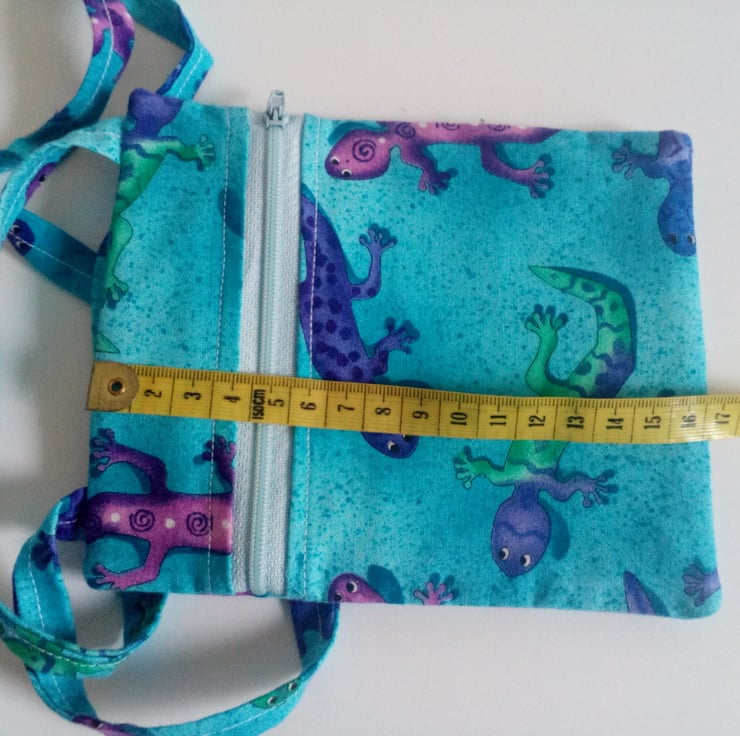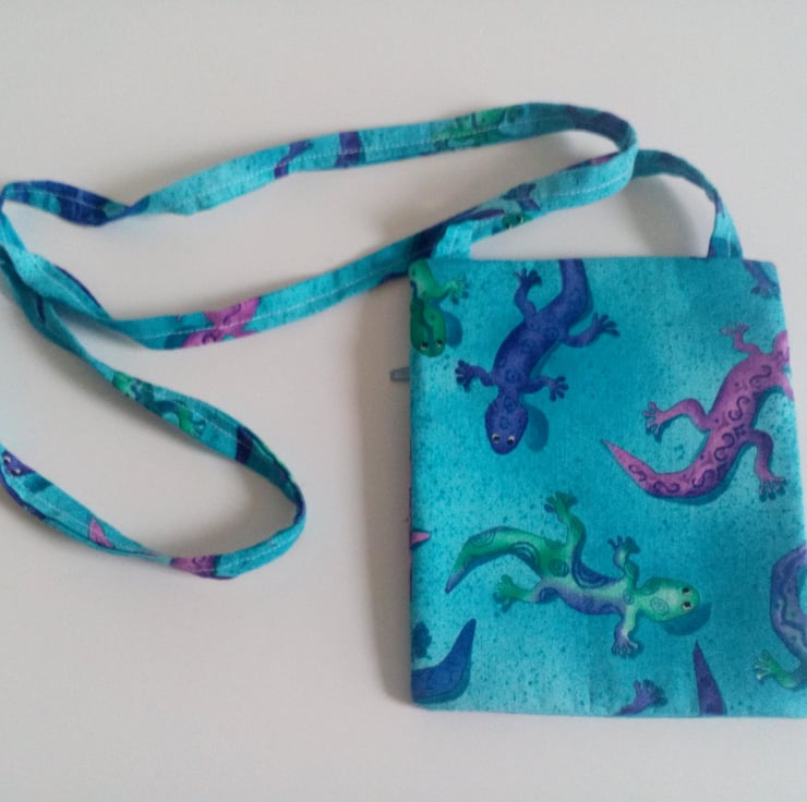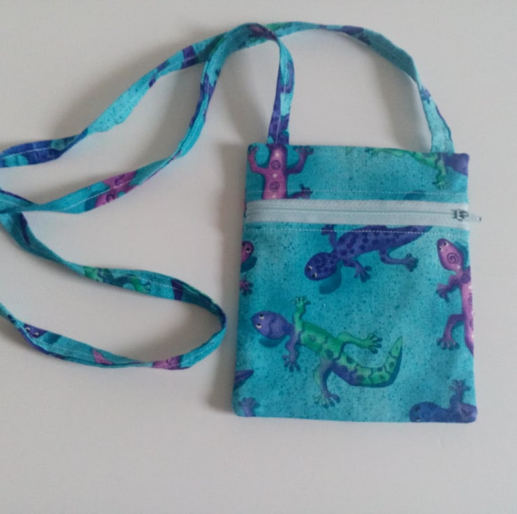 A turquoise crossbody bag featuring a lizard design. It has a zipped closure, two small internal pockets and is lined.