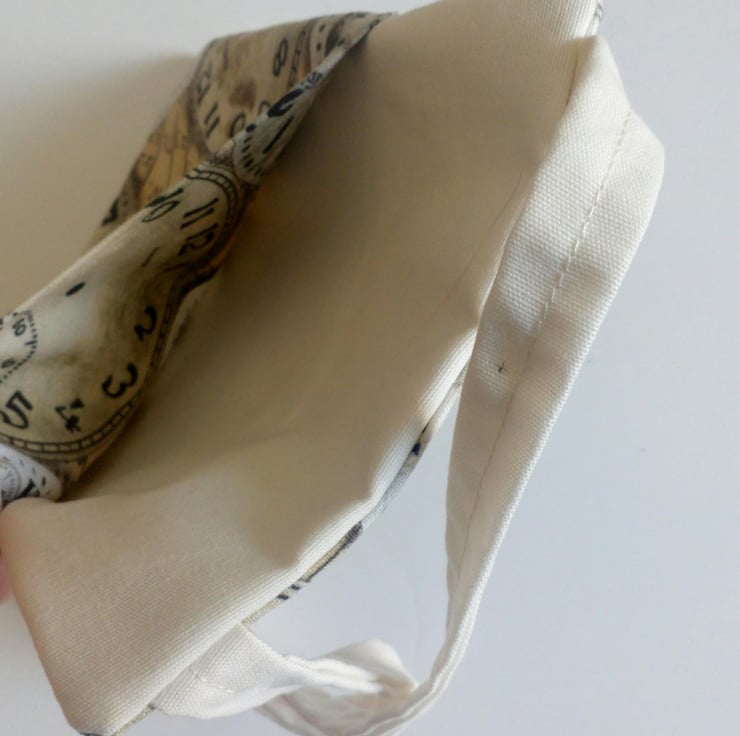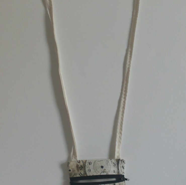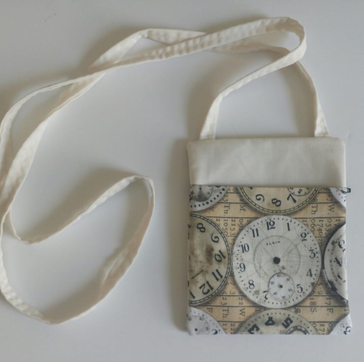 This is a Steampunk style clock face design Crossbody bag made from 100% cotton. It has a main zip section which is lined and has a back pocket.