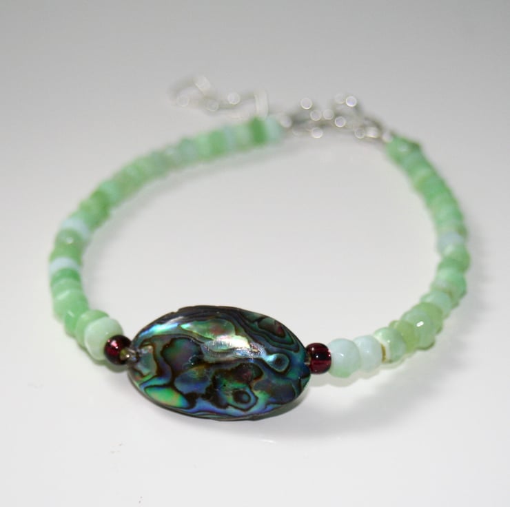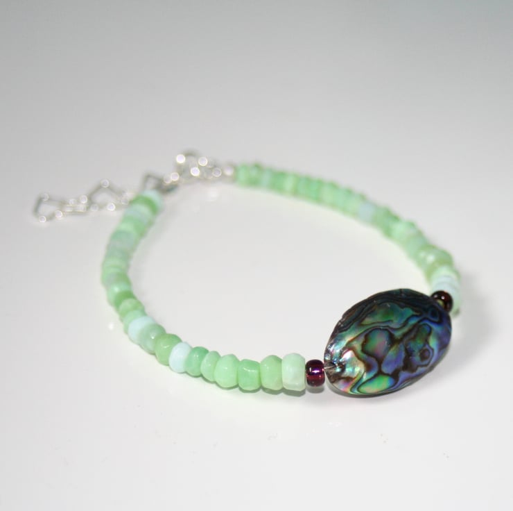 A stunning piece of natural abalone shell is the focal of this pretty bracelet. The abalone has an iridescent shimmer with colours of turquoise blue, peacock green and gold and measures 2.5 x 1.5cm.