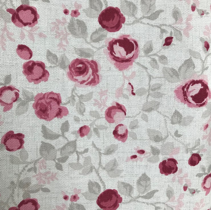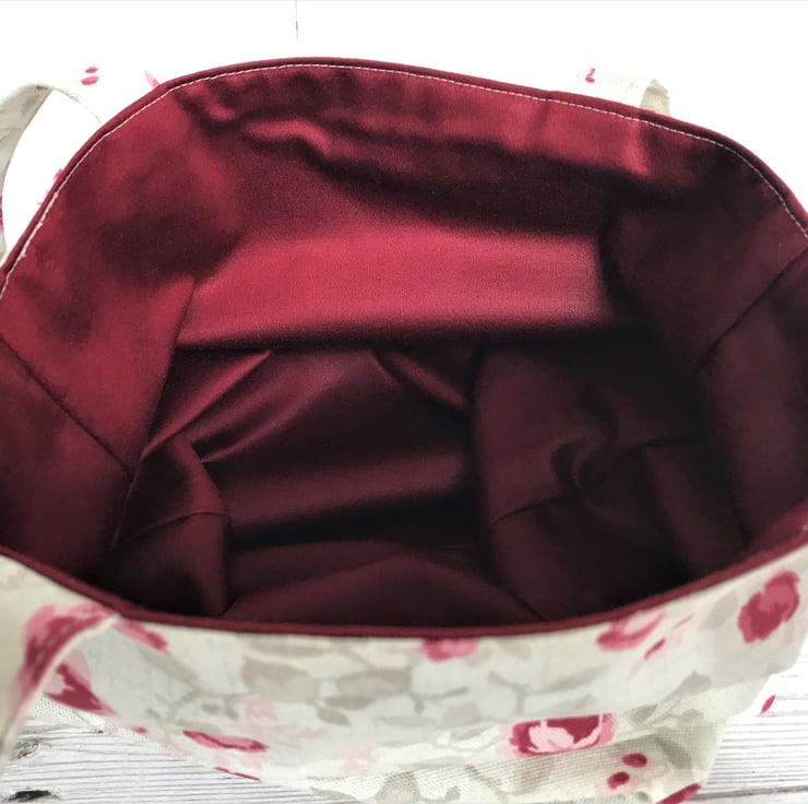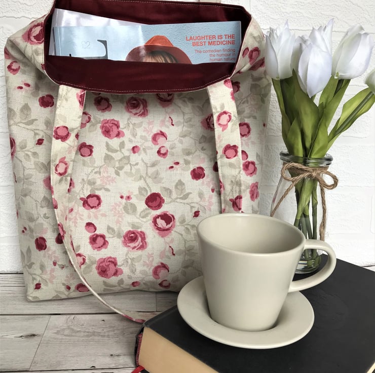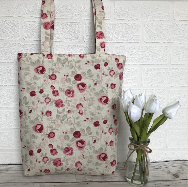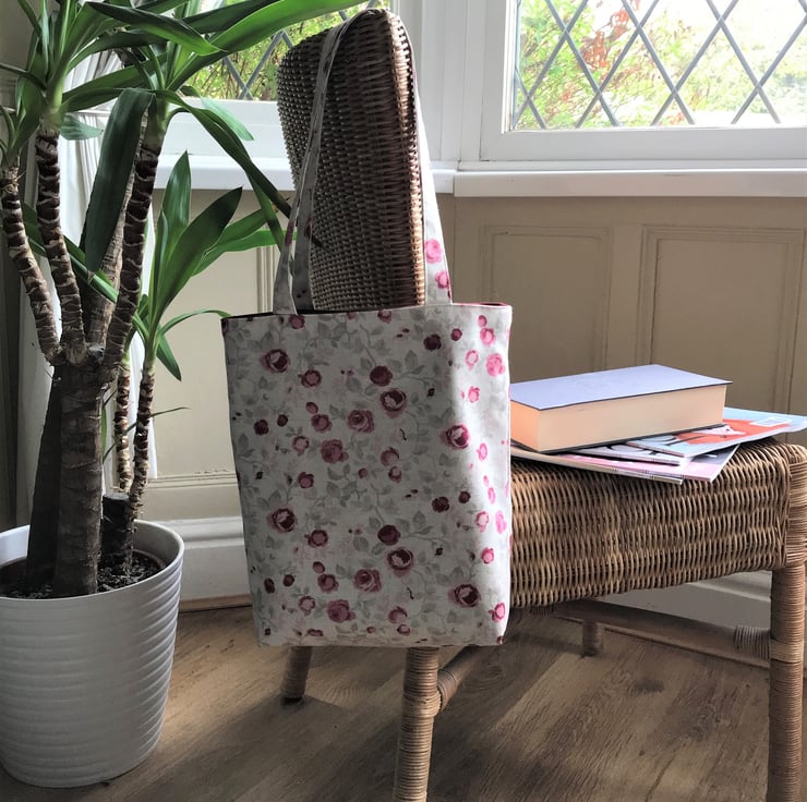 A shabby chic style tote bag in cream fabric with a pretty print pattern featuring small pink and magenta roses and grey foliage. The bag is lined with a lovely magenta fabric which complements the outer fabric perfectly.