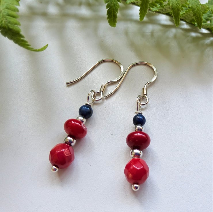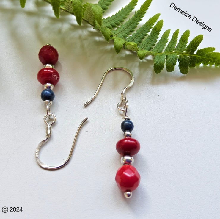 A very pretty delicate pair of earrings designed and hand crafted using genuine farmed coral, lapis lazuli and all 925 sterling silver components.