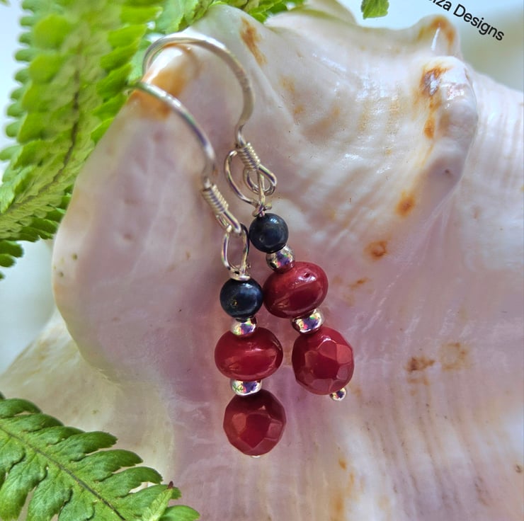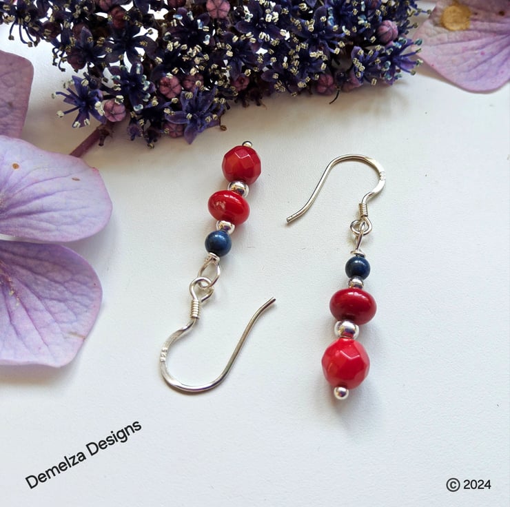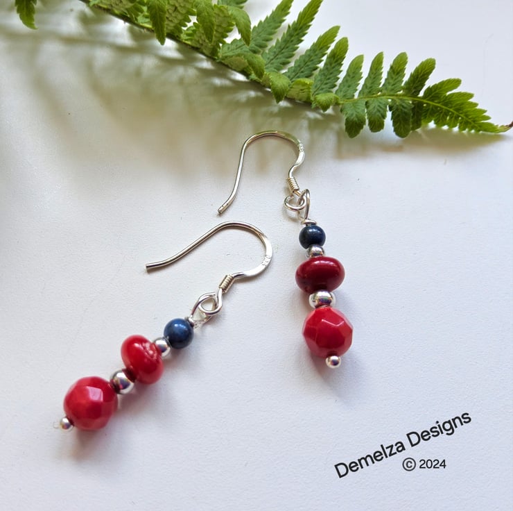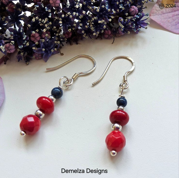 Dainty Designer Red Coral & Lapis Lazuli Sterling Silver Drop Earrings