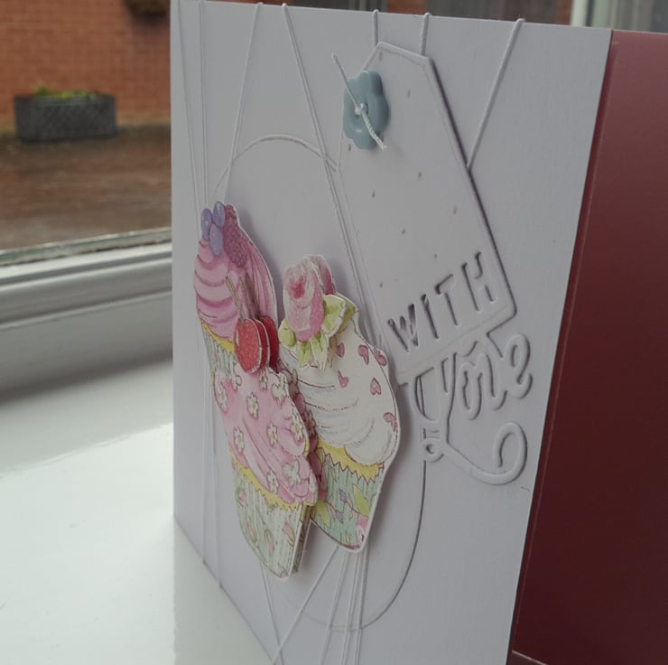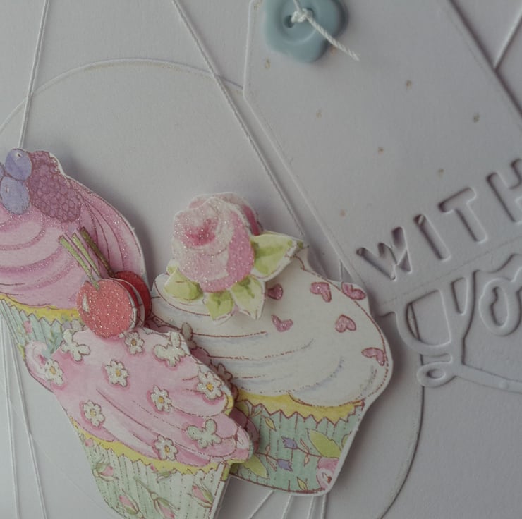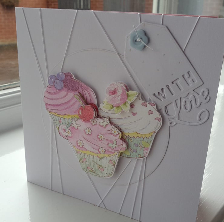 A completely handmade and uniquely designed card. Consisting of a trio of cupcakes decoupaged. Mounted onto a circle of white card and then onto pristine quality white card. Highlit in fine silver glitter. White thread has been wrapped around to add extra interest and finished off with a die cut with love card from white card, embellished with a flower blue button.