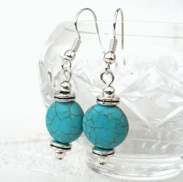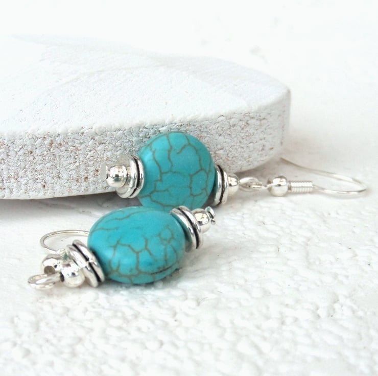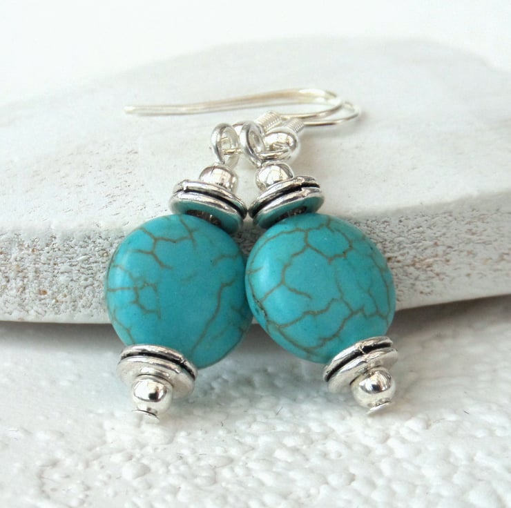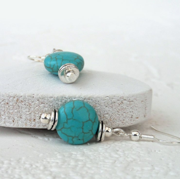 Reconstituted turquoise coins hang with silver coloured beads and silver plated wires in these pretty earrings.