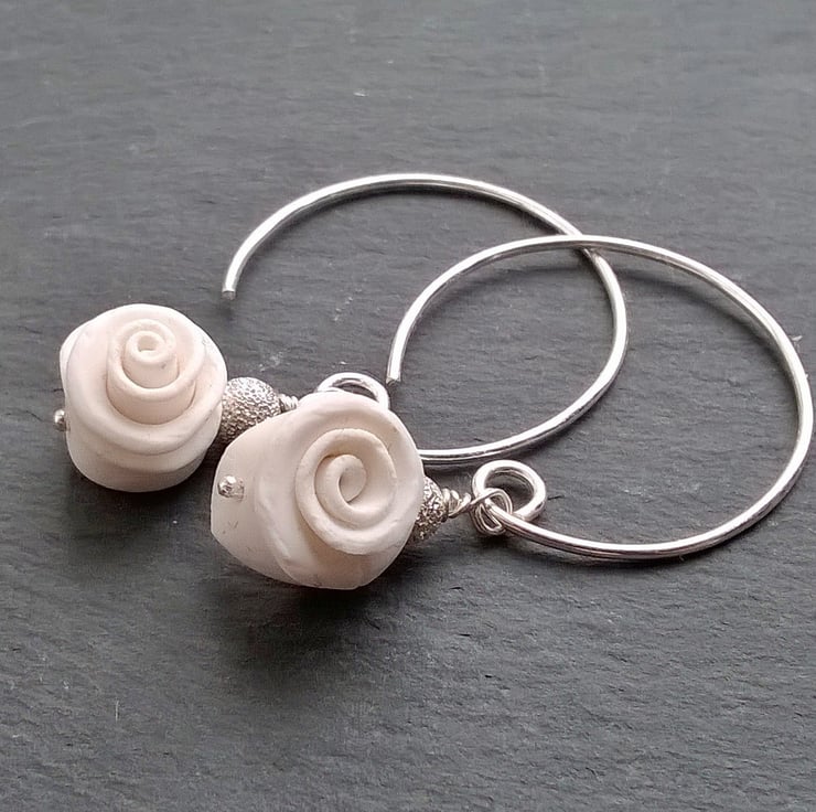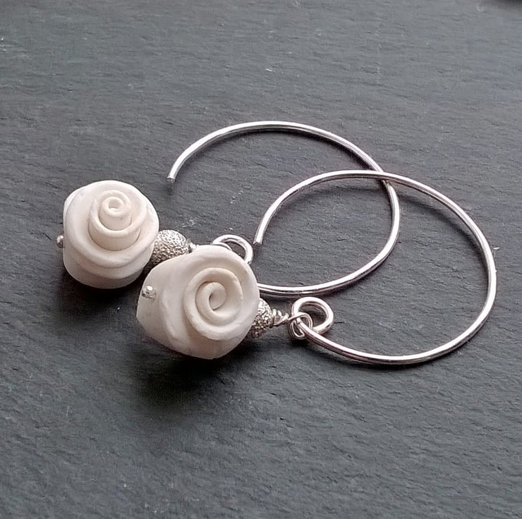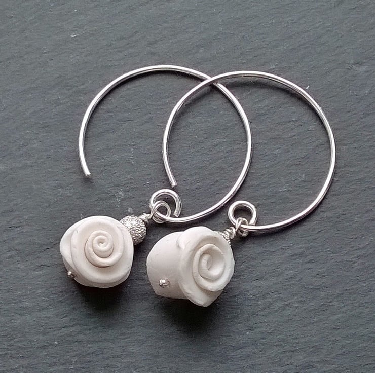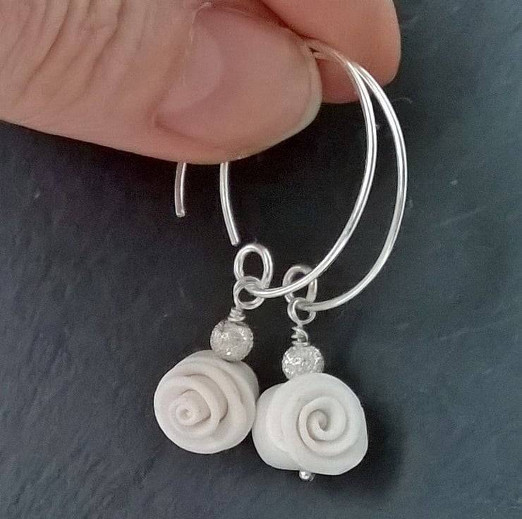 The white roses are handmade from polymer clay and each is accented with a silver sparkle bead. The hoops are silver plated.