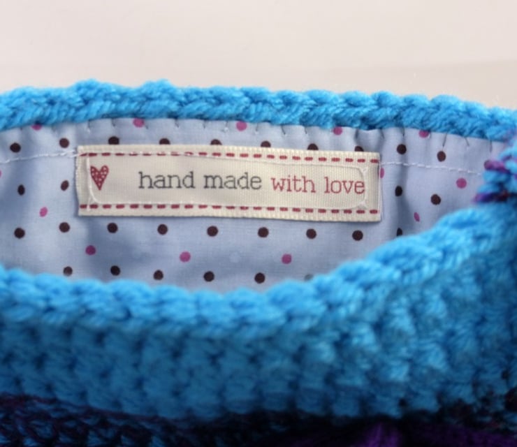 A chunky bright coloured crocheted bag using two strands of yarn in turquoise and dark purple and decorated with a purple french knitted flower and matching butterfly button. The bag measures 8" at the base narrowing to 6.5" at the top by 7.5" high and the crocheted strap should be long enough to wear the bag across the body. The bag is lined with a pretty spotty polycotton fabric. An ideal gift for any little girl.