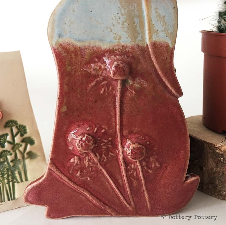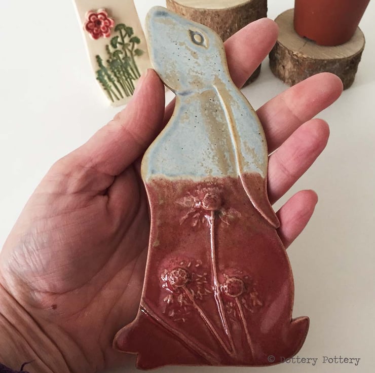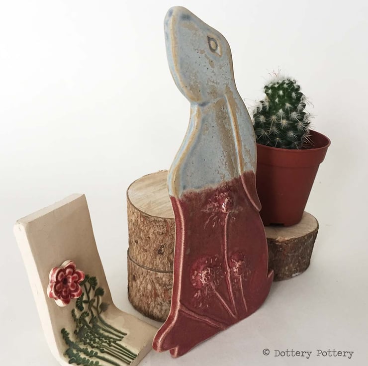 This delightful moon gazing hare is made from textured stoneware clay and decorated with pattern. It is cut from a hand drawn template.