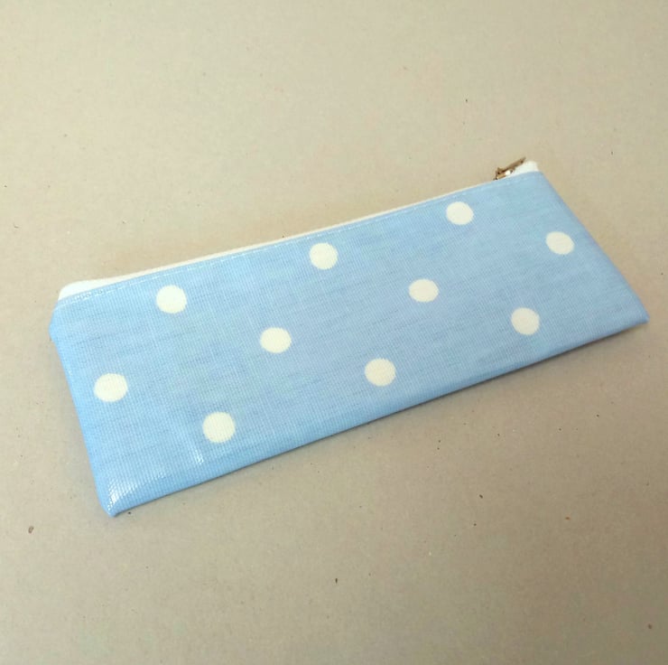 Handmade in a pale blue oilcloth with white spots