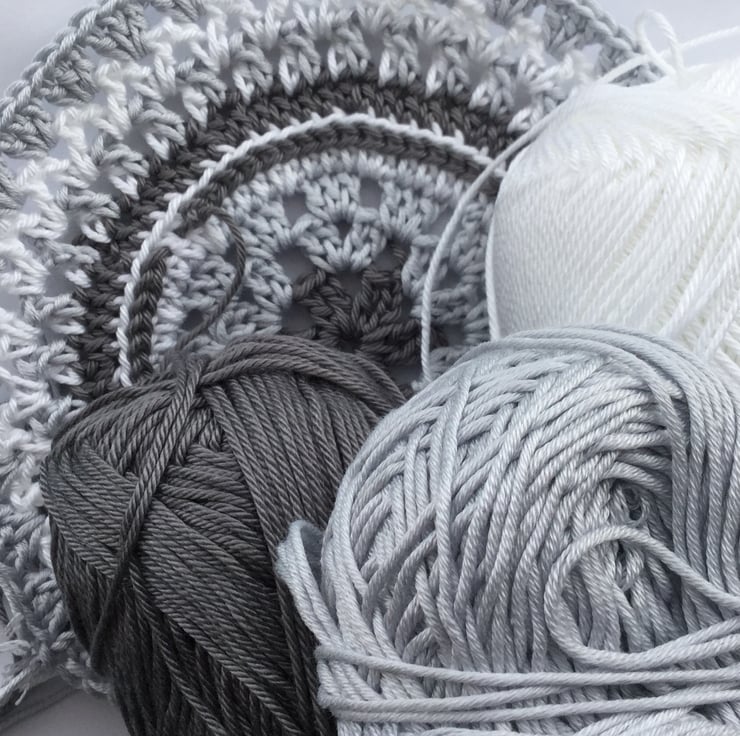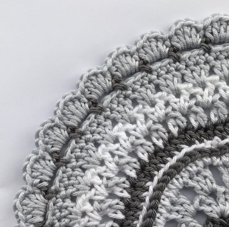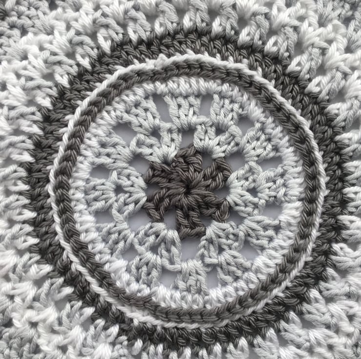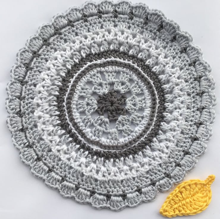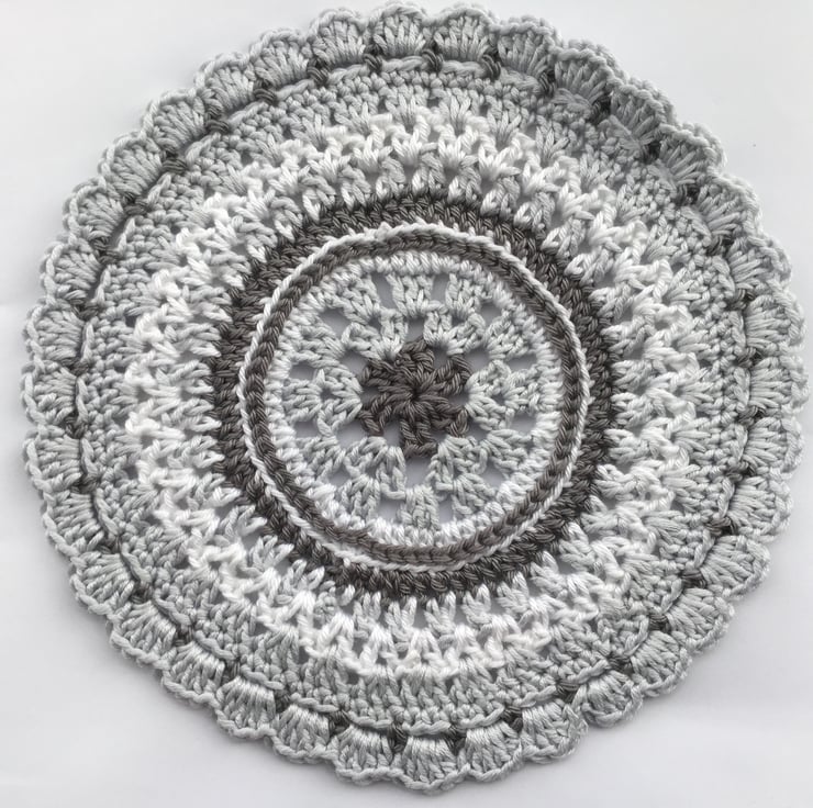 I have crocheted this monochrome Mandala style table mat using a hard wearing, good quality 100% cotton yarn in white and grey.