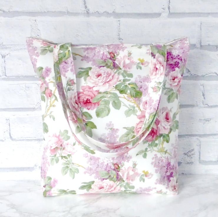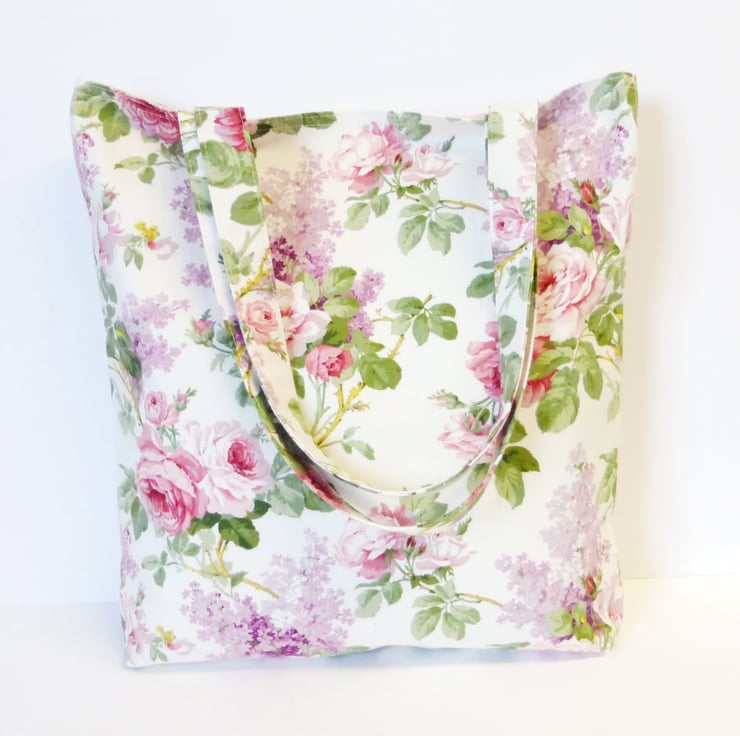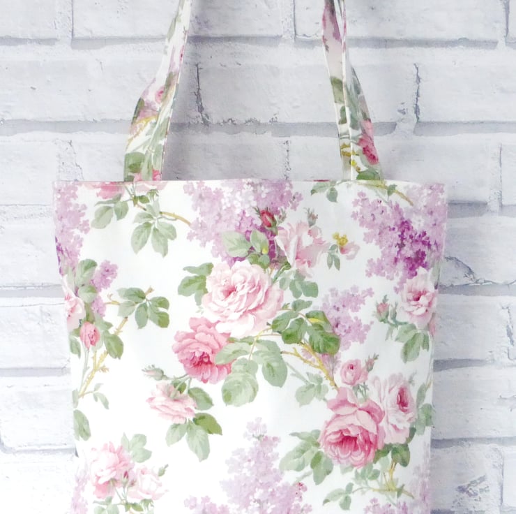This is a lovely everyday floral medium sized tote bag/shopping bag made with a Sanderson furnishing weight fabric in a pretty floral design in shades of pink and lilac on a white background.