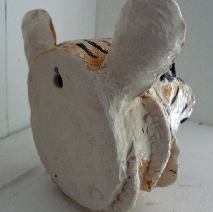 Modelled animal head in clay. Approx 13 x 13 cms. Hangs by panel pin. Hand painted & fired to earthernware.