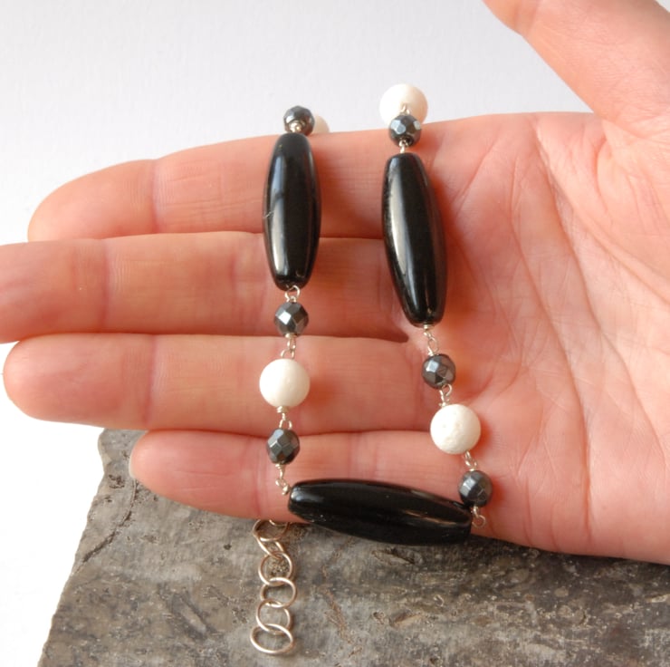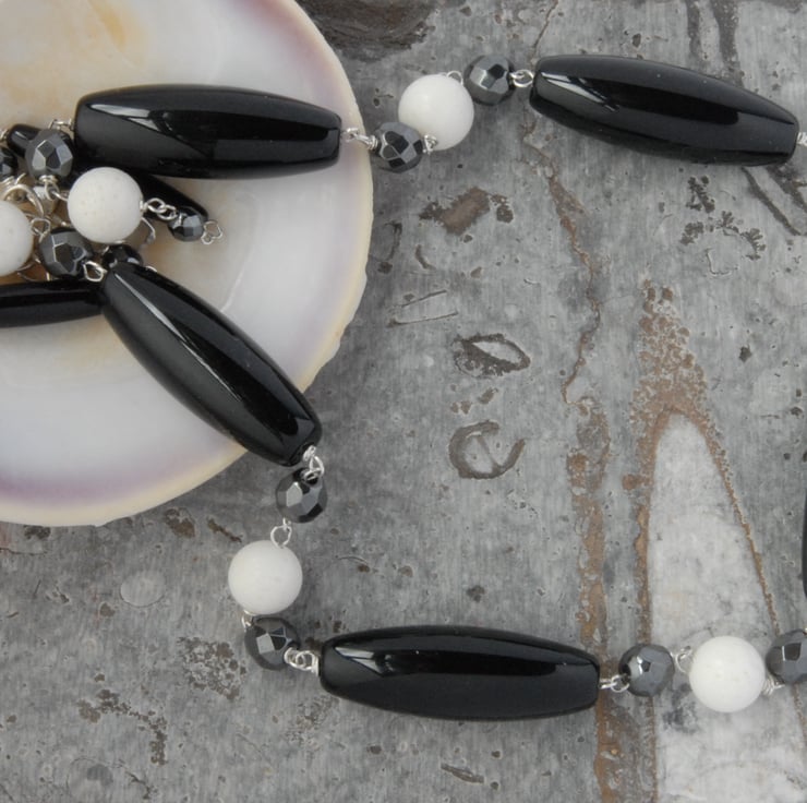 This beaded necklace features chunky elongated barrel beads of glossy black onyx inter spaced with gunmetal haematite and creamy white coral beads. The haematite beads are faceted for a touch of sparkle and this necklace could easily be worn during the day or to dress up an outfit in the evening. The beads are individually rosary linked on sterling silver wire and it is finished off with a sterling silver clasp and extender chain. Coral is associated with the 35th wedding anniversary and this would be an idea gift if you think they might not like the rich pinky colour coral normally is.