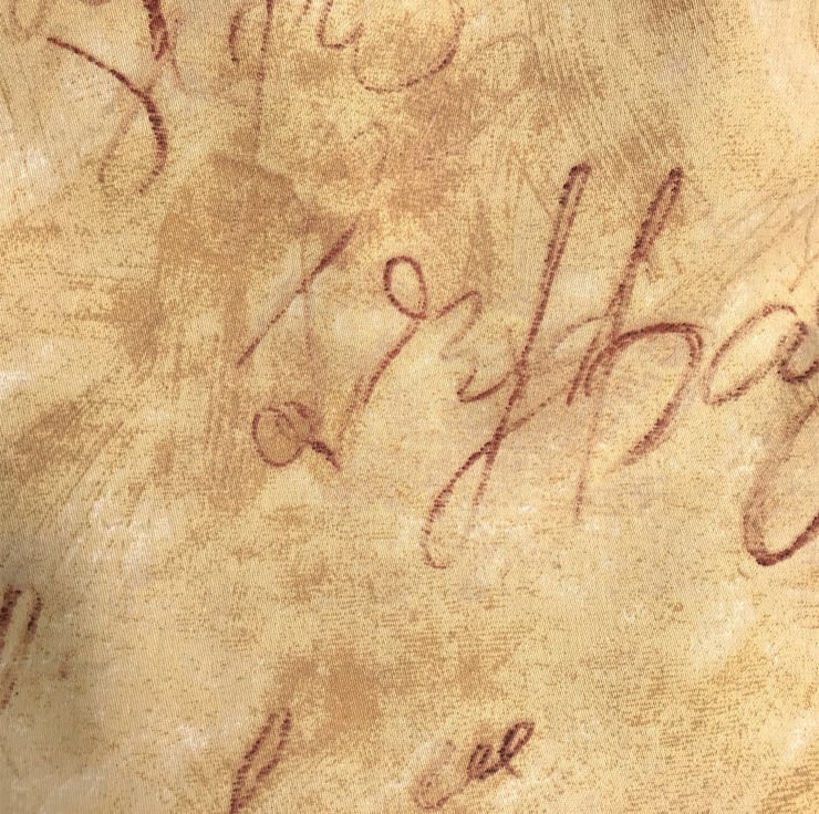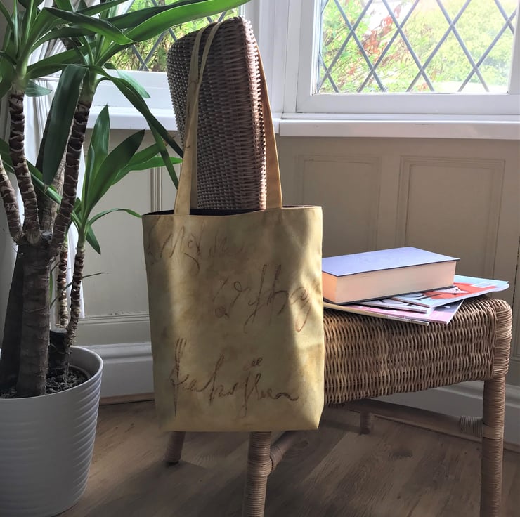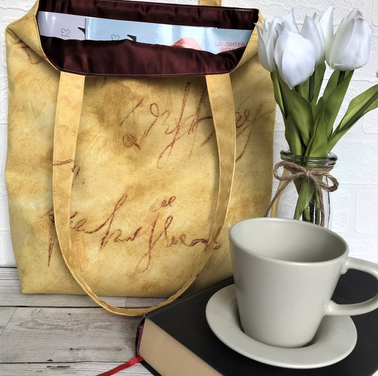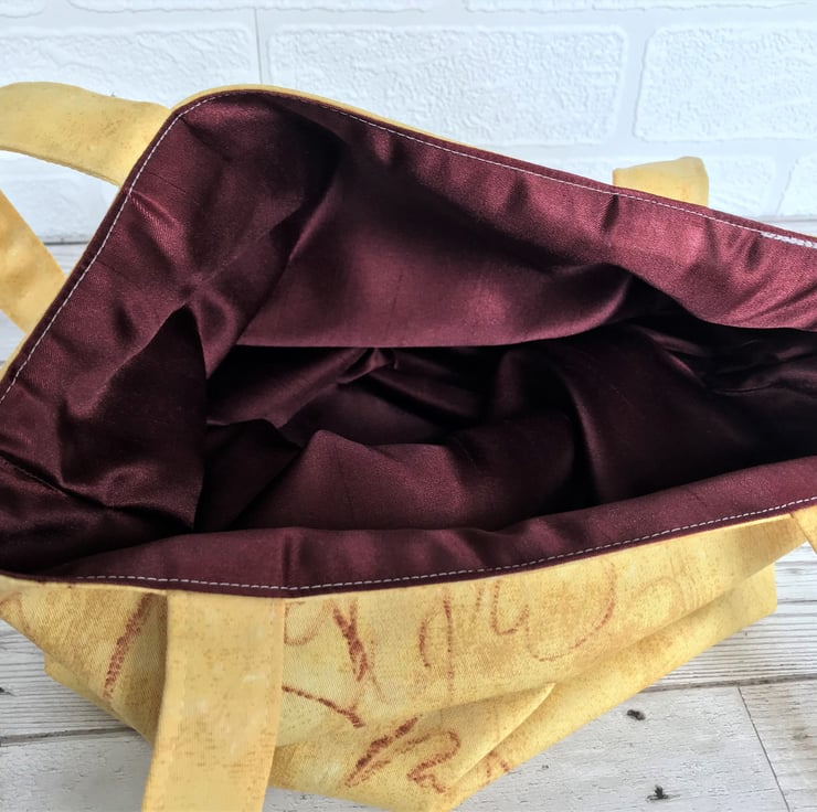 A handy tote bag in lovely mottled golden yellow fabric with an unusual print pattern of handwriting in dark red. The pattern takes the form of looped handwriting but with no legible words The bag is lined with dark red satin fabric which matches the red colour of the pattern on the outer fabric.