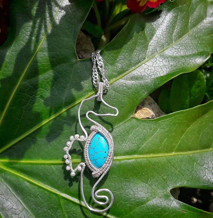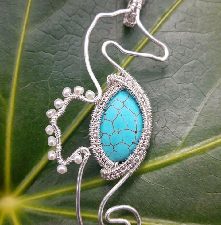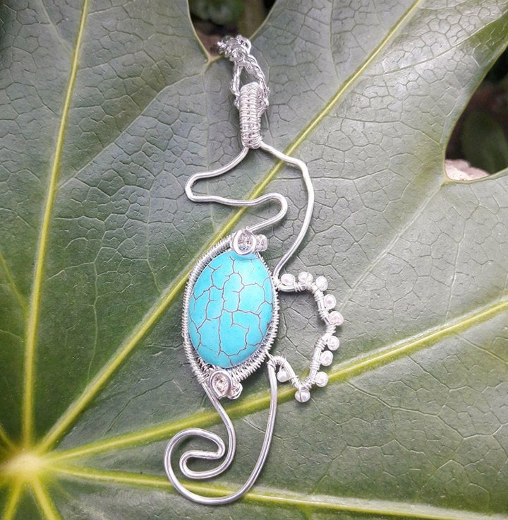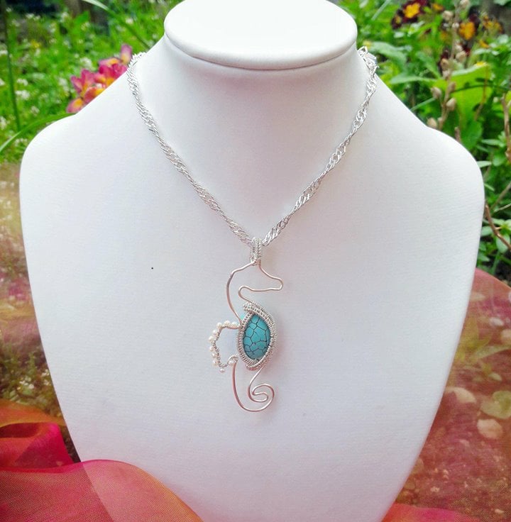 Handmade Wire work Seahorse with turquoise howlite and tiny Natural Seed pearls. I have created a decorative wire weave around the turquoise stone to make a focal point and the dorsal fin is edged with the seed pearls.