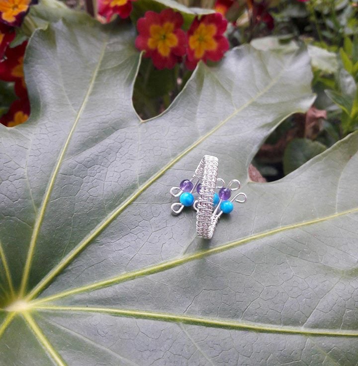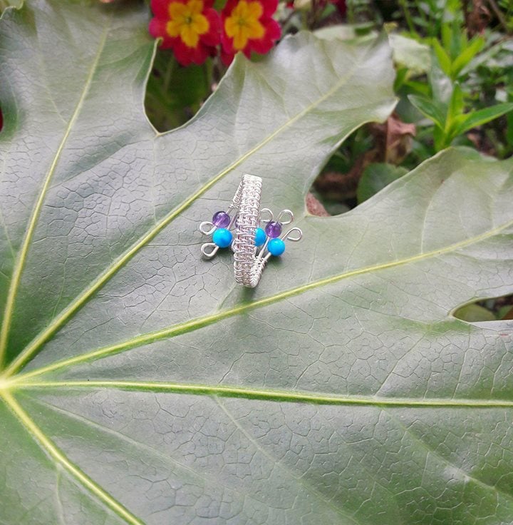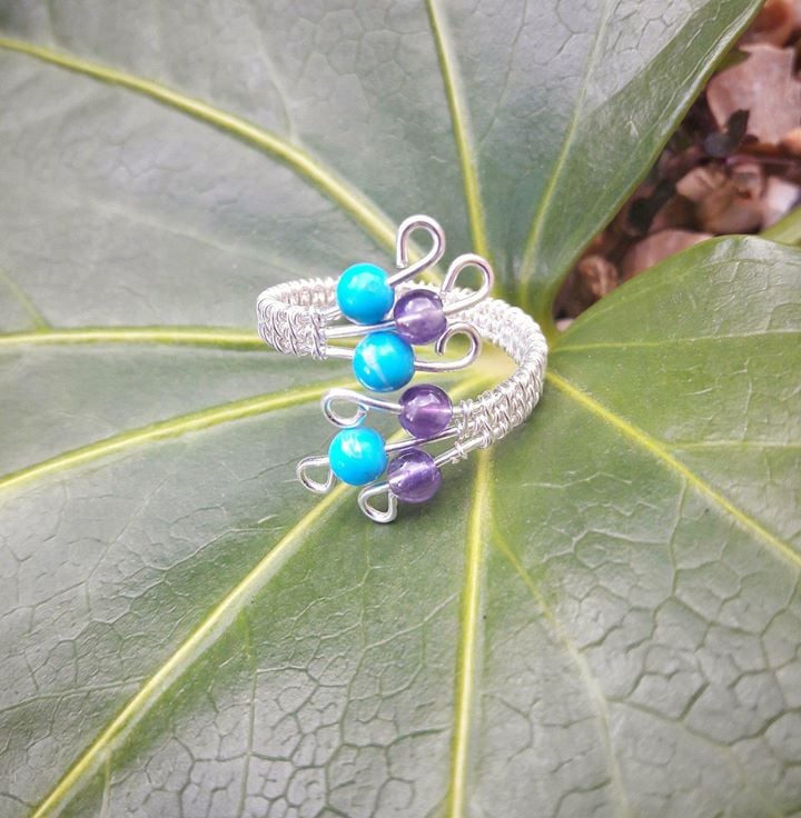 SALE ITEM REDUCED FROM £18.95 TO £9.95. Sale ends Saturday 16th March.Handmade Wire wrapped Sterling Silver Ring with Amethyst and Turquoise Howlite. Adjustable ring will fit Size P to V approx. I have used a number of thicker base wires and created a basket weave effect using a fine sterling silver Wire. Stunning purple and turquoise summer colour Gemstone beads 4mm have been added to each wire with a decorative swirl on the end to secure each bead in place.