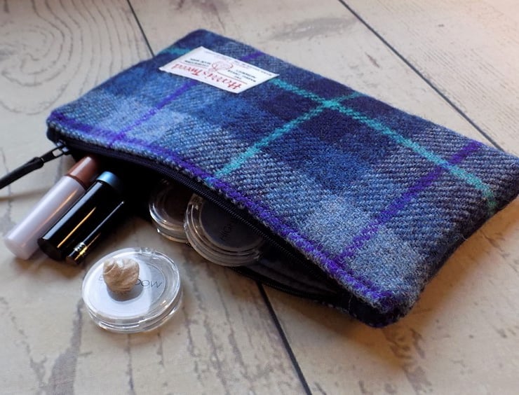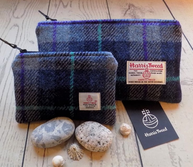 The pouches carry the Harris Tweed label which authenticates the fabric as pure new wool, hand woven in the Outer Hebrides of Scotland.