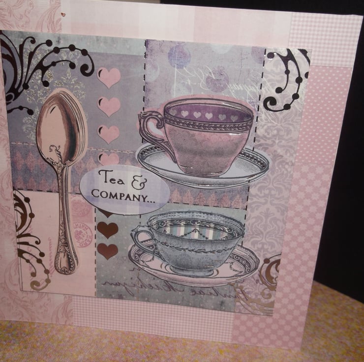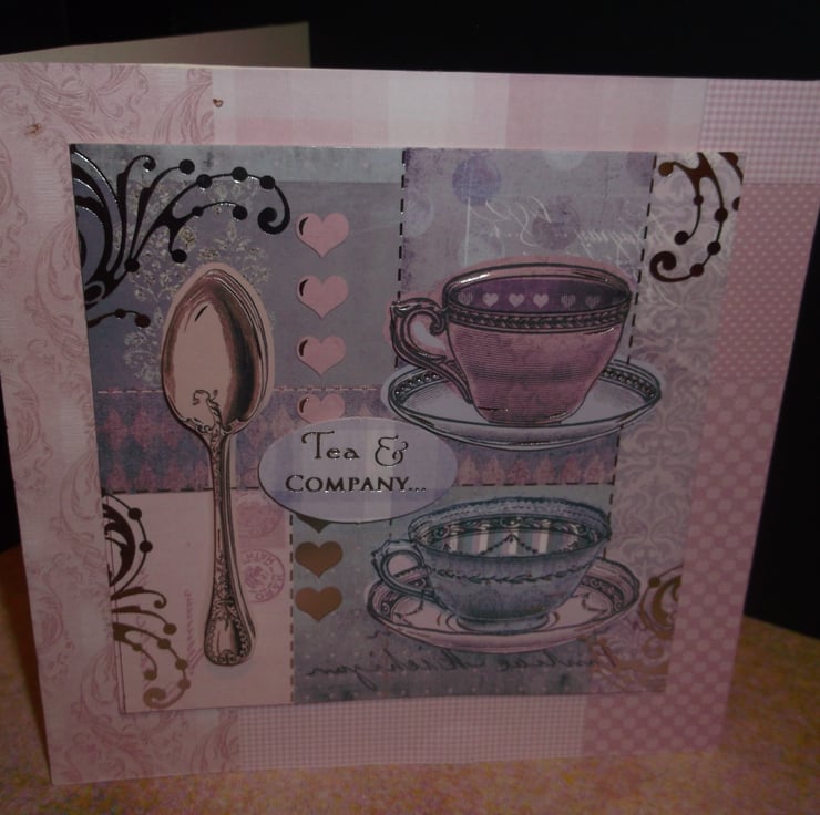 Greetings card with two 3d cups and saucers and spoon