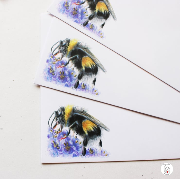 - 5 white 6 x 4 inch envelopes with the bumble bee design printed in the left hand corner.