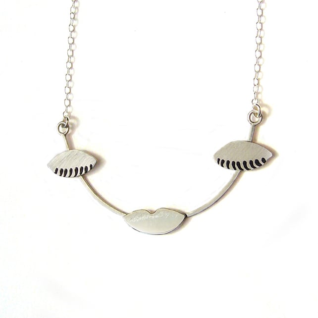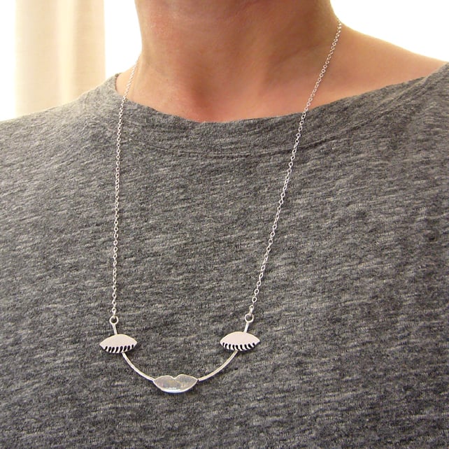 Imagine a piece of jewellery that is unique, yet simple. This quirky necklace features a pared back face, showing 2 closed eyes and a mouth. She has been handmade using sterling silver and is part of a collection of 3 unusual face necklaces.