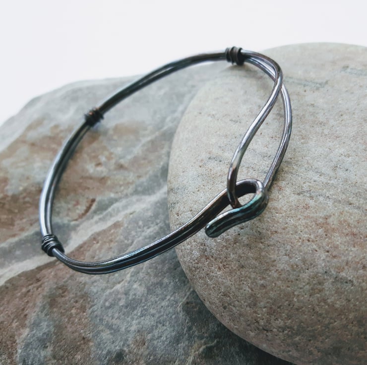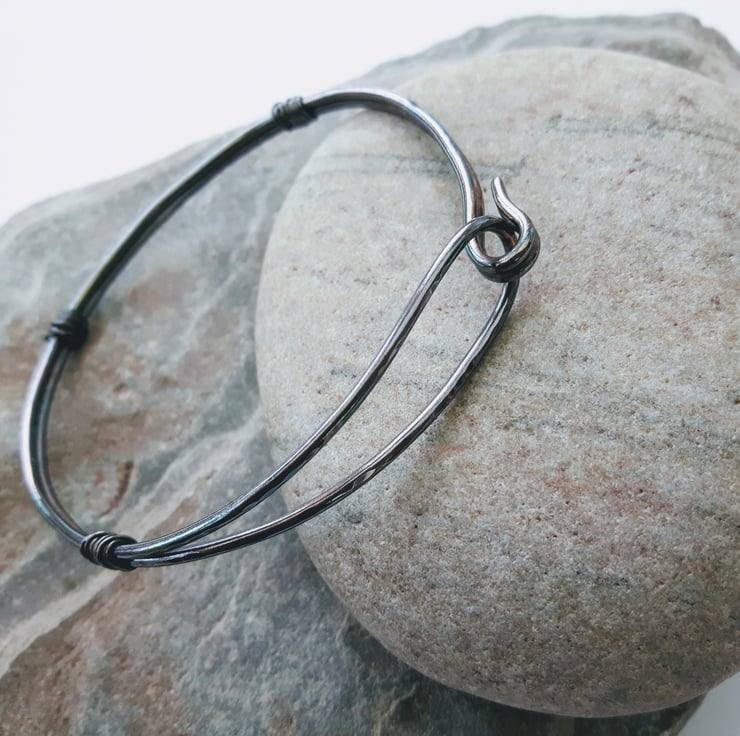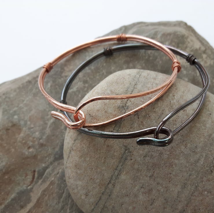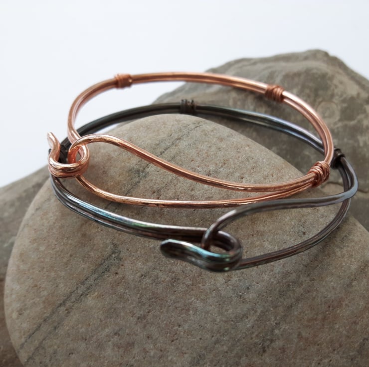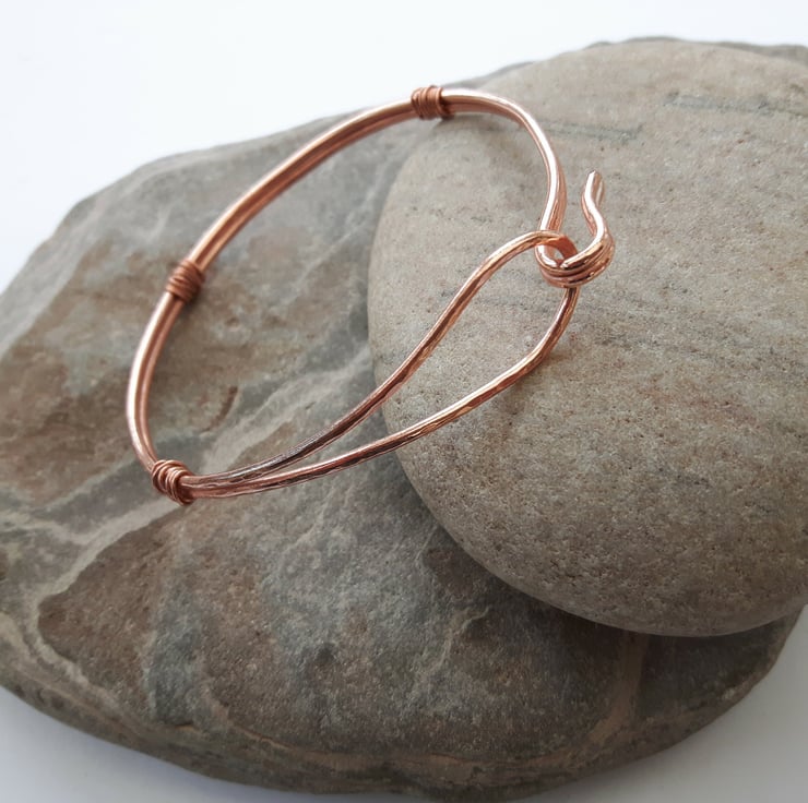 This bangle is made from a length of copper wire which has been folded in two and then formed into a loop at one end and a hook at the other. The double strand is wire-wrapped at three points and has been hammered to create a dimpled texture. I can supply the bangle with a choice of two finishes. Please note that the price quoted is for a single bangle and you need to specify the colour on your order. In one bangle, the copper has been oxidised to a darker vintage bronze colour and finished with Renaissance wax to preserve the patina. The other has been left with a natural bright copper finish. If you like I can seal this with metal lacquer to avoid discolouration. Just add a note to your order. The bangles are round in shape and will fit a medium-sized wrist. They can be opened by freeing the hook and easing the wire gently over the hand without bending it too vigorously.
