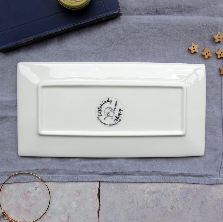 Hand decorated using digital transfers of my watercolour illustrations, each tray has a unique design (this listing is for the tray you can see in the photographs). My illustrations are professionally printed onto ceramic transfers that can withstand being kiln fired to 800°C. Each bird, leaf, seedhead etc is printed individually for me to compose each design from the separate elements as I decorate the tray making each one special and unique.