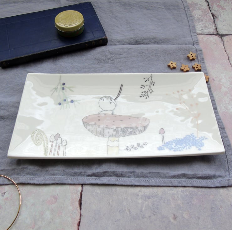 A pretty addition to your dressing table this delicate rectangular tray with long tailed tit and mushroom illustrations makes a pretty receptacle for all your trinkets and treasures. Can also be used as a serving platter for biscuits or nibbles.