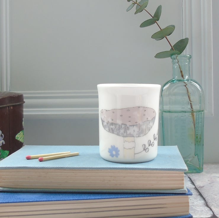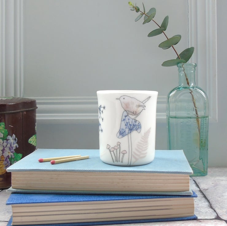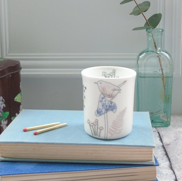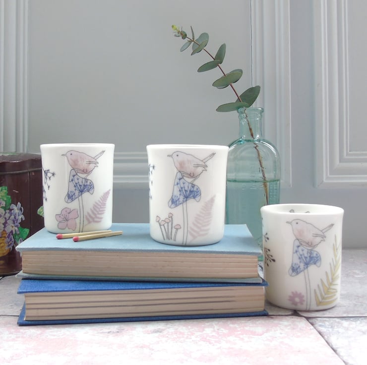 Hand decorated using digital transfers of my watercolour illustrations, each votive has a unique design (the tealight holder you receive will portray the wren on toadstool as shown but other elements will vary to keep each one unique). My illustrations are professionally printed onto ceramic transfers that can withstand being kiln fired to 800°C. Each bird, leaf, seedhead etc is printed individually for me to compose each design from the separate elements as I decorate them making each one special and unique.