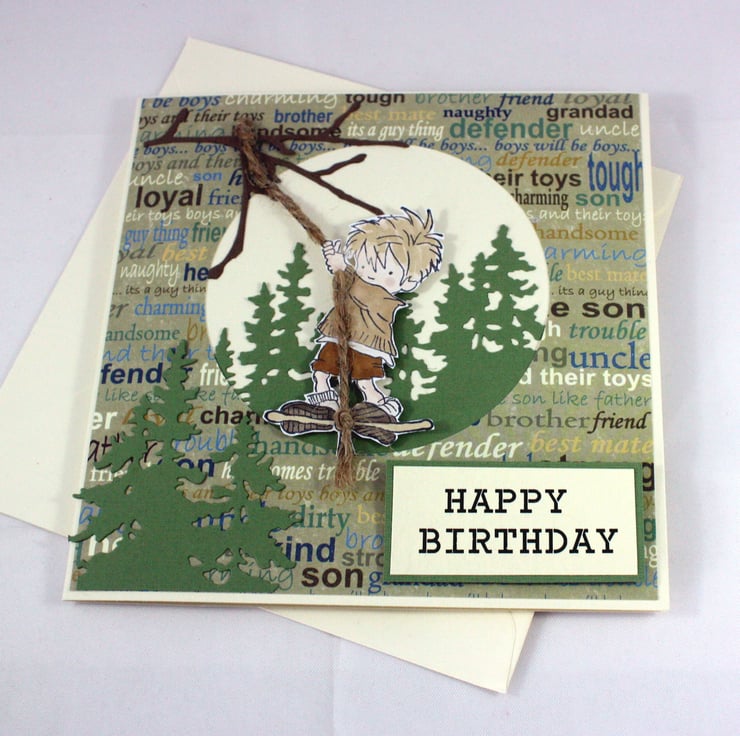 Square, child's birthday card featuring a hand stamped and coloured image of a little boy swinging on a rope from a tree branch. The boy has been cut out to give a 3d feel. The rope has been added with jute string.
