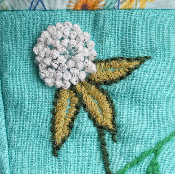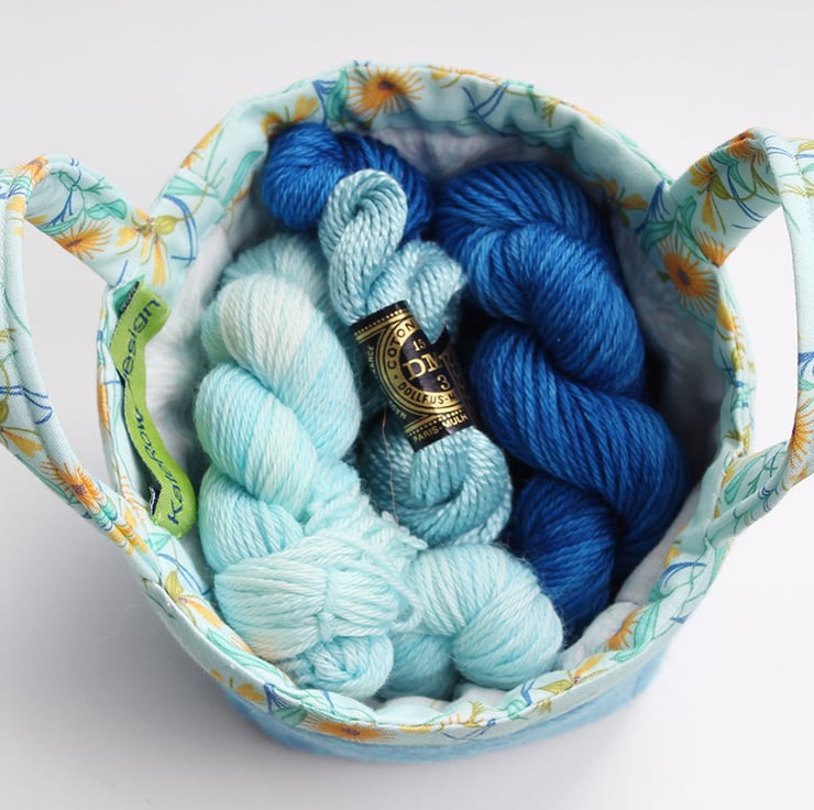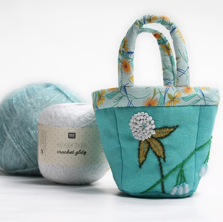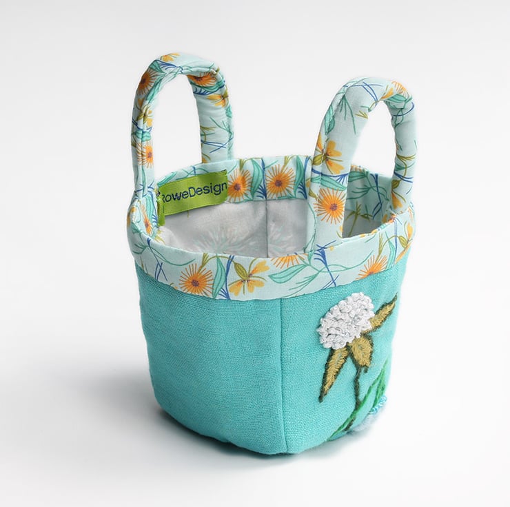 This is a very small project bag for little tiny items that you want to keep together and find easily as you work. It is made from turquoise linen and lined with my own grey thistle print and trimmed with my aqua marigold print(both cotton). I have hand embroidered a clover and bluebell flower onto the outer. The bag is bucket shaped to help you find your items quickly. The depth of the bag is 10.5cms(4 inches) and the base measures 7cms square (2.5 inches square)