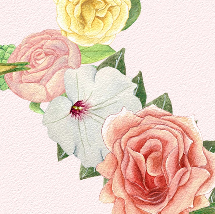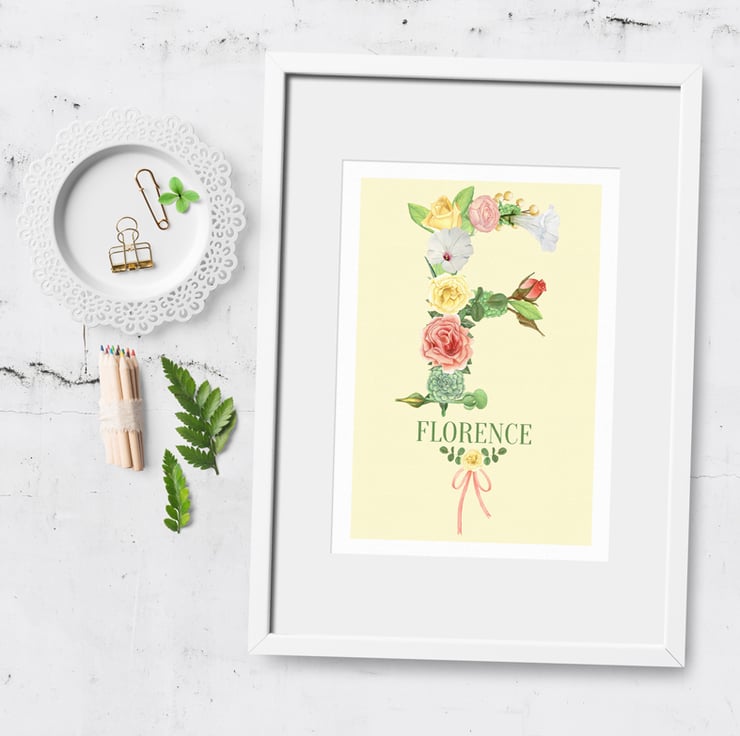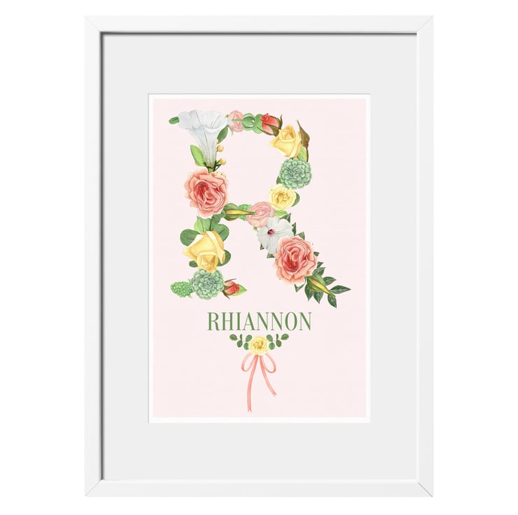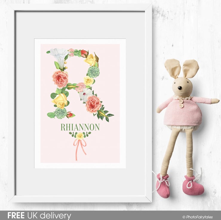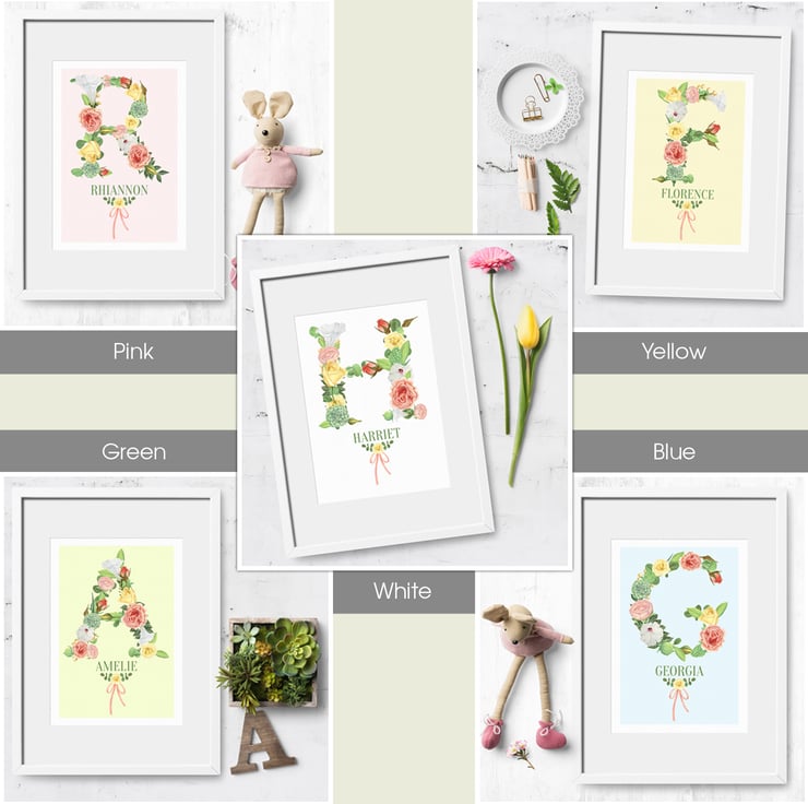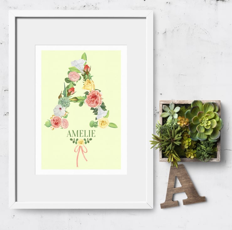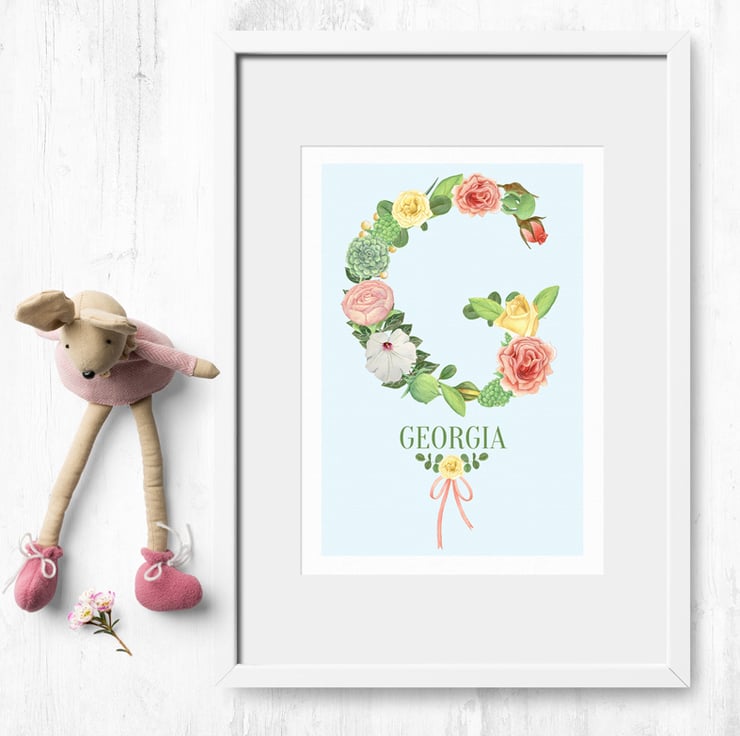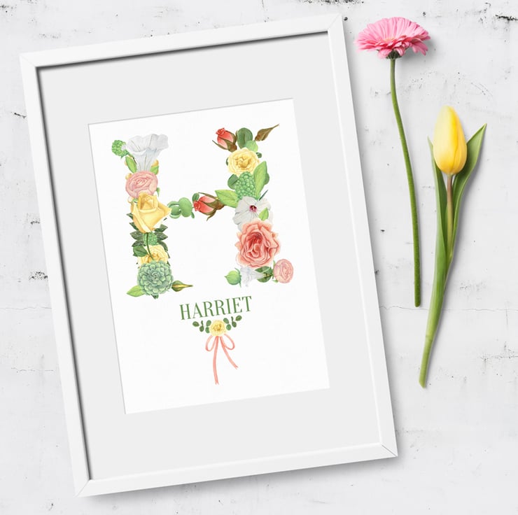 These lovely botanical style prints are personalised with your chosen name and the initial is created in stunning watercolour flower graphics. The flower illustrations were hand painted using watercolours and soft coloured pencils, and look exquisite on the lightly textured watercolour paper.
