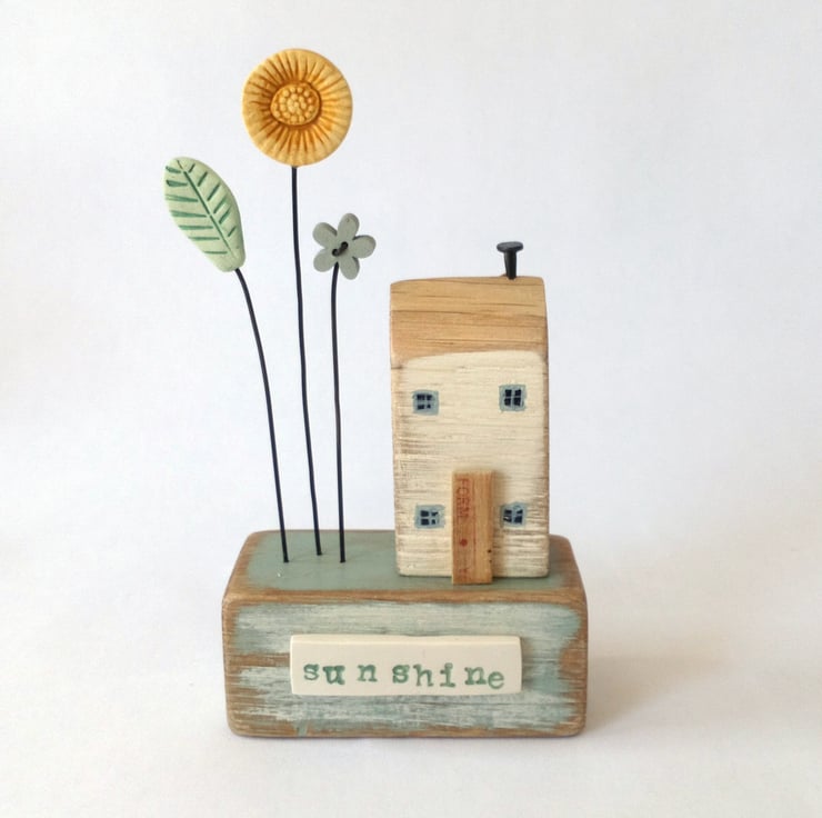 The tiny door is a bit of vintage ruler and the sign beneath is hand stamped with the word 'sunshine'