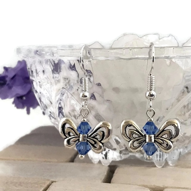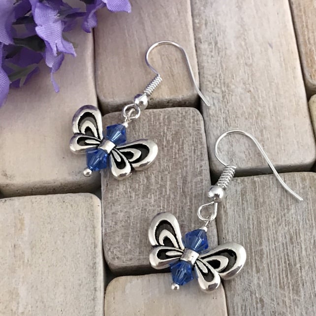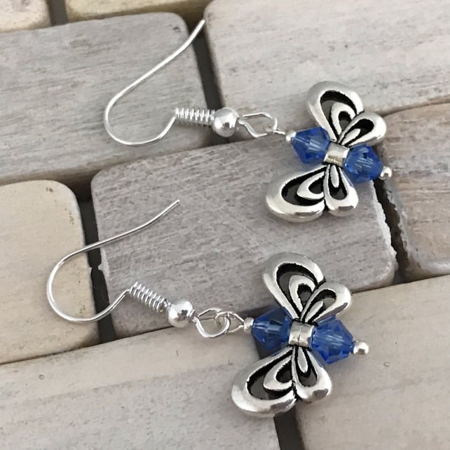 Each earring has been made using blue crystal bicones and silver coloured wings.