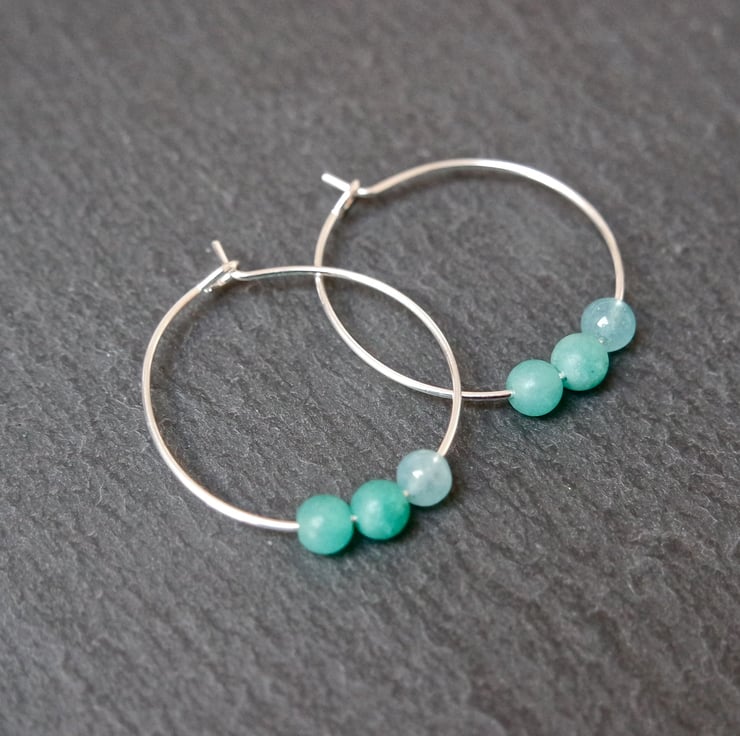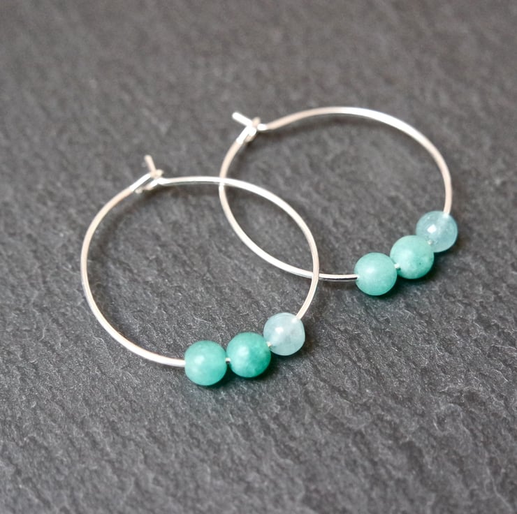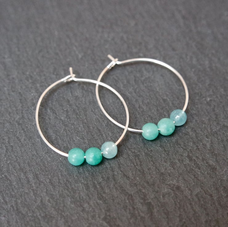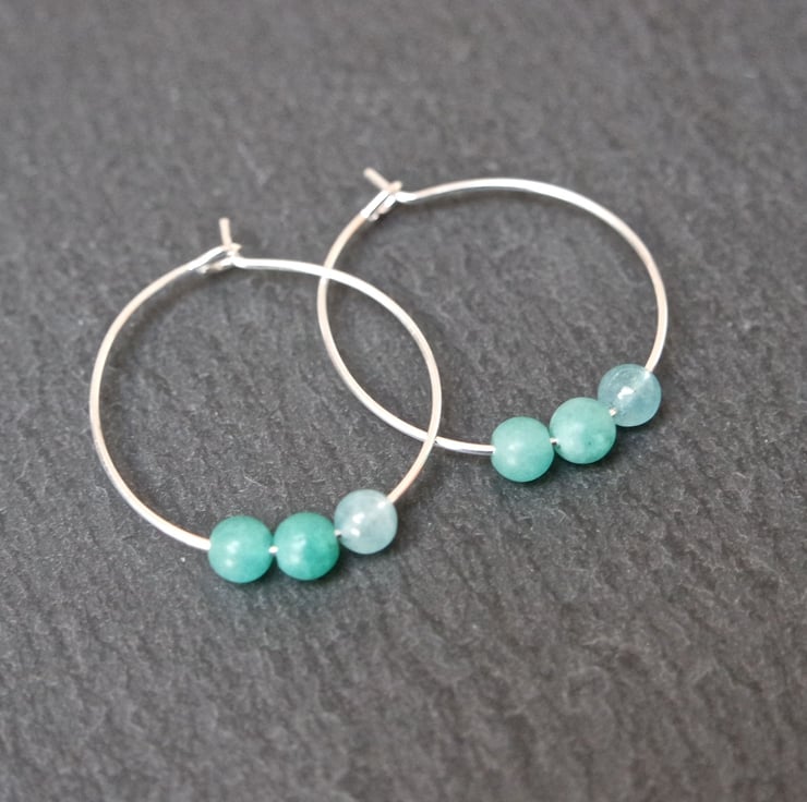 A silver plated pair of hoops with 1 shiny turquoise and 2 matt green quartz beads on each hoop.