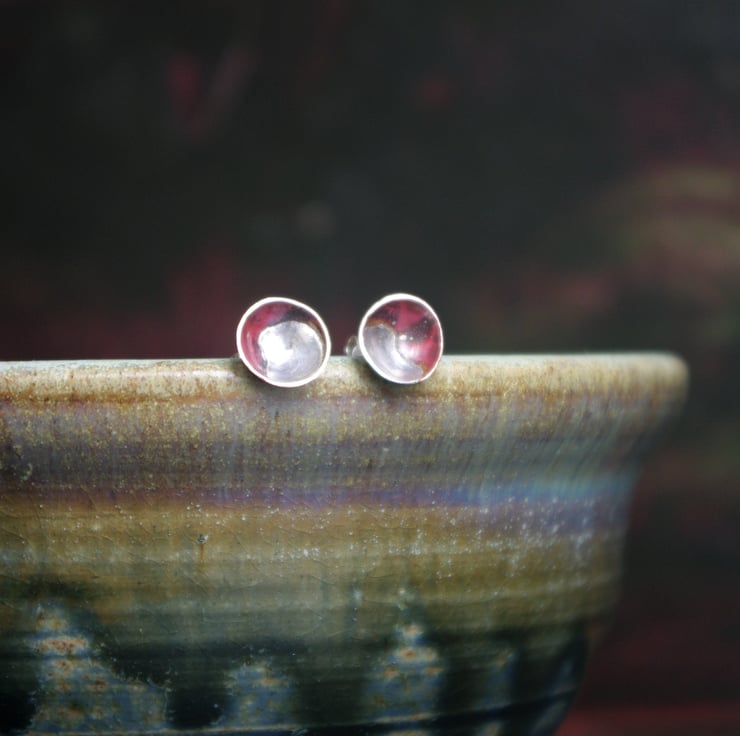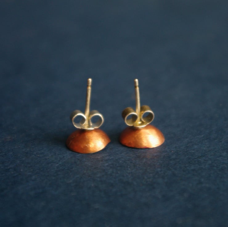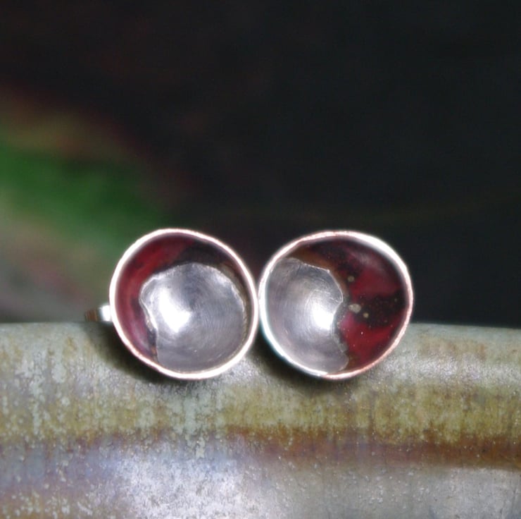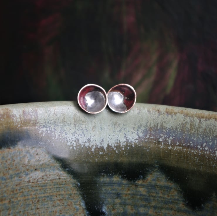 I have soldered a sterling silver abstract shape into a copper cup, which is not perfectly round and has a diameter of 9mm. The copper on the inside has deeper shades of red appearing as a result of patination . I have brought the back of the cups to shiny copper as well as the edges.