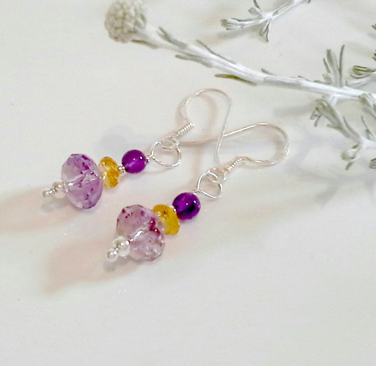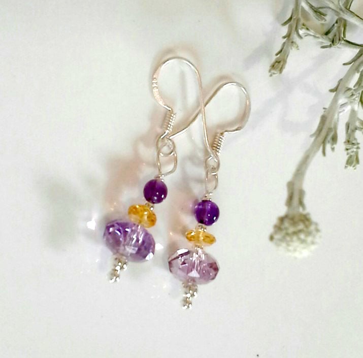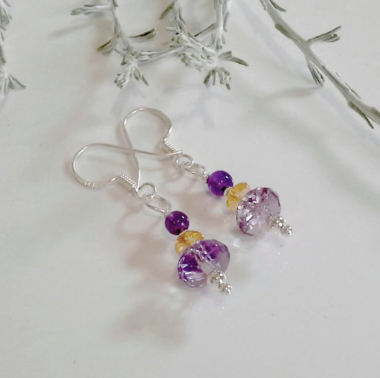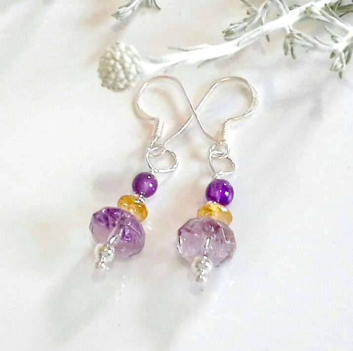 The earrings have been designed and hand crafted using faceted wheel shape ametrine and citrine gemstones with round amethyst gemstones. They are delicate in design and light weight making them perfect for everday wear without being intrusive or uncomfortable. They would make a perfect quality gift for those whom appreciate and value unique genuine gemstone jewellery.
